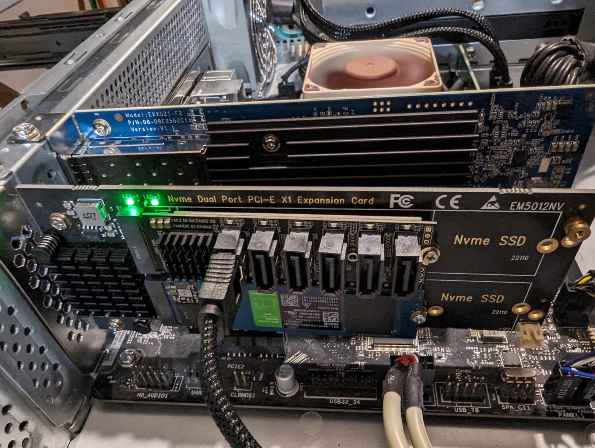 Checked out an M.2 6 x SATA ASM1166 adapter from Amazon, is indeed faster than the “old” JMB 5 x SATA thingy (564 MB/s read instead of 544 MB/s with the same SSD).