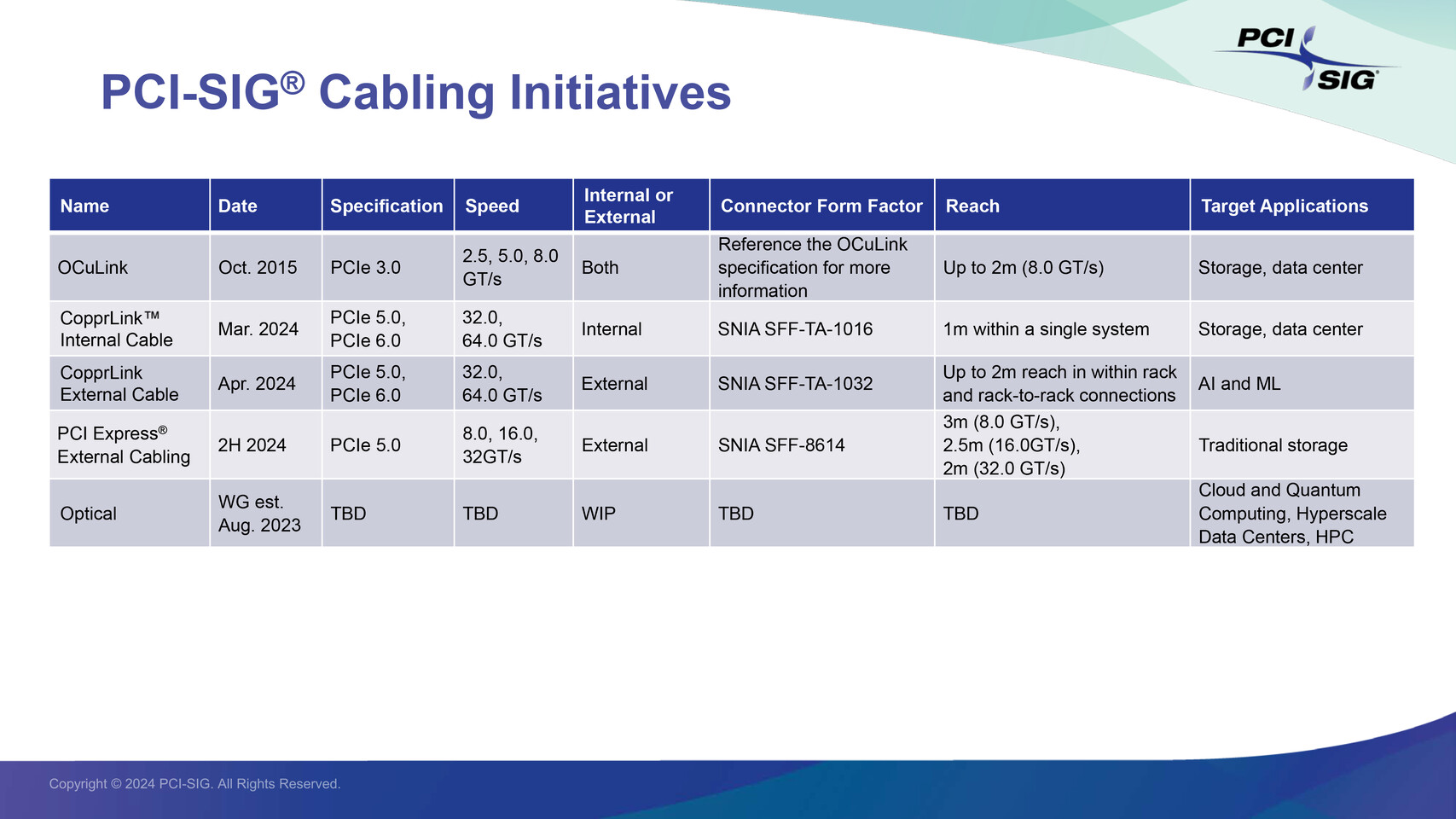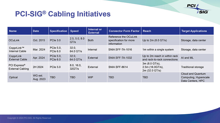 As far as I can tell, MCIO (SFF-TA-1016) is internal CopprLink. That they’re investigating its extension to PCIe 7.0 speeds means it’s going to stick around in the market. I guess that’s good for economy of scale? ¯\_(ツ)_/¯