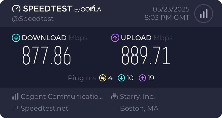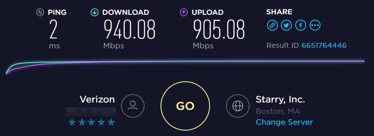 Then in 2017 their gigabit service (well, 940 down 880 up) became available. It was only $20 a month more than their 150 service, so I figured why not?
