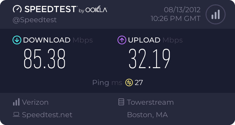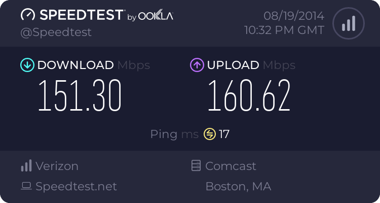 Then two months later in August of that year Verizon sent out an email to their FiOS customers that they were making their bandwidth symmetrical, and that I was being bumped to 150/150 at no extra charge. I was excited to get home and test it, and it checked out: