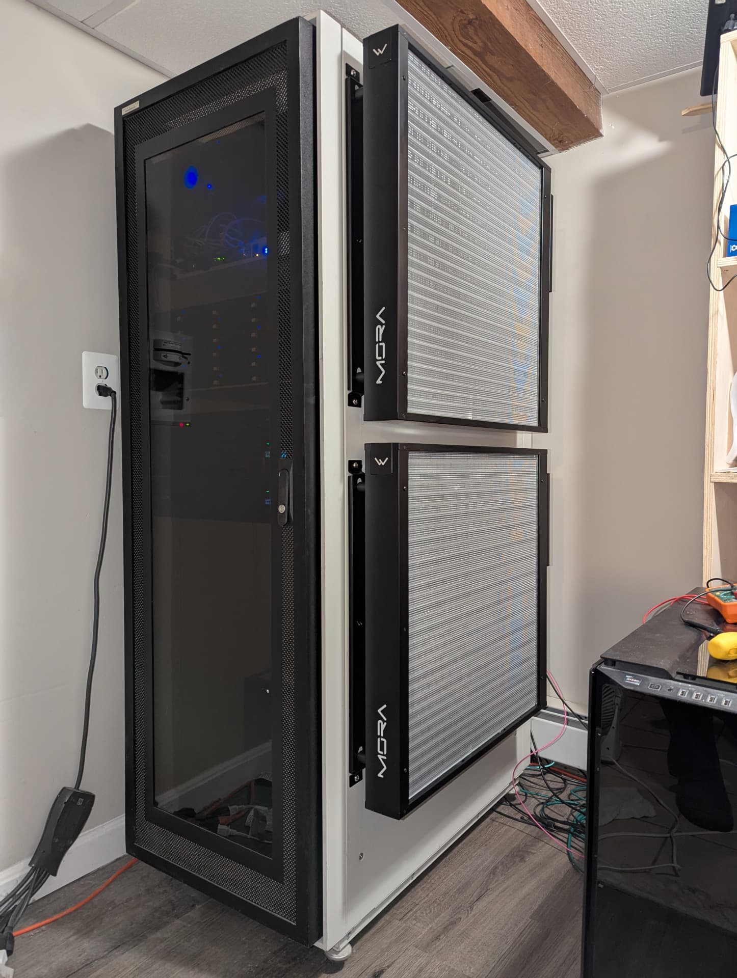 Step 15.) (2025) I really want to play Stalker2, but it runs like crap on my workstation, and upgrading workstations is getting really expensive, and for all that money, consumer/gaming performance is still crappy. Maybe I should just build a dedicated game machine? It looks like that would be cheaper than trying to chase workstation performance. Oh, and they should both have excellent cooling. Those new MORA IV Radiators Watercool released look really nice and are huge.,… What if I hung them on the side of the rack, and used them to cool the workstation and game machine? (This project is still in process)