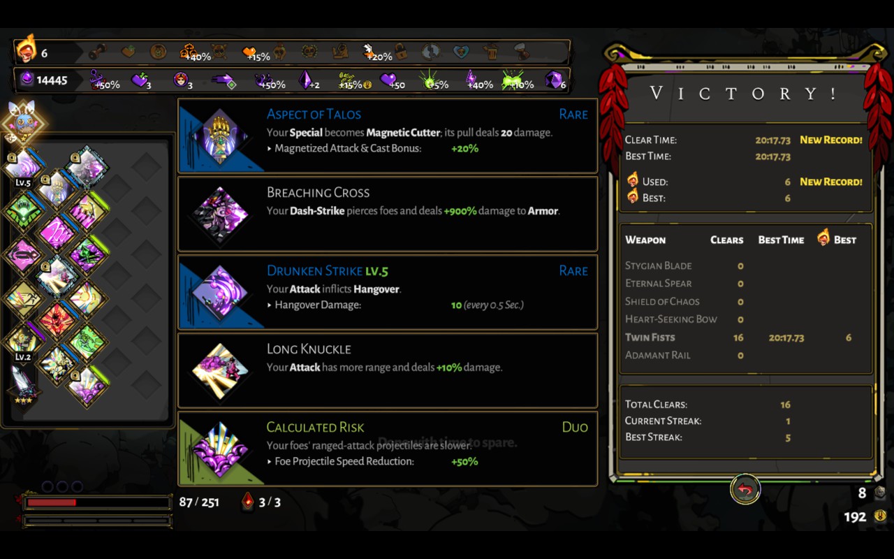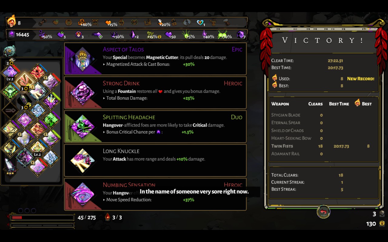 In my recent runs, I find myself leaning more towards Dionysus and Artemis as my attack and special boons. The duo boon Splitting headache is a must have to do enough dps to Hades. In most of my recenr runs, I need at least two death defiances.