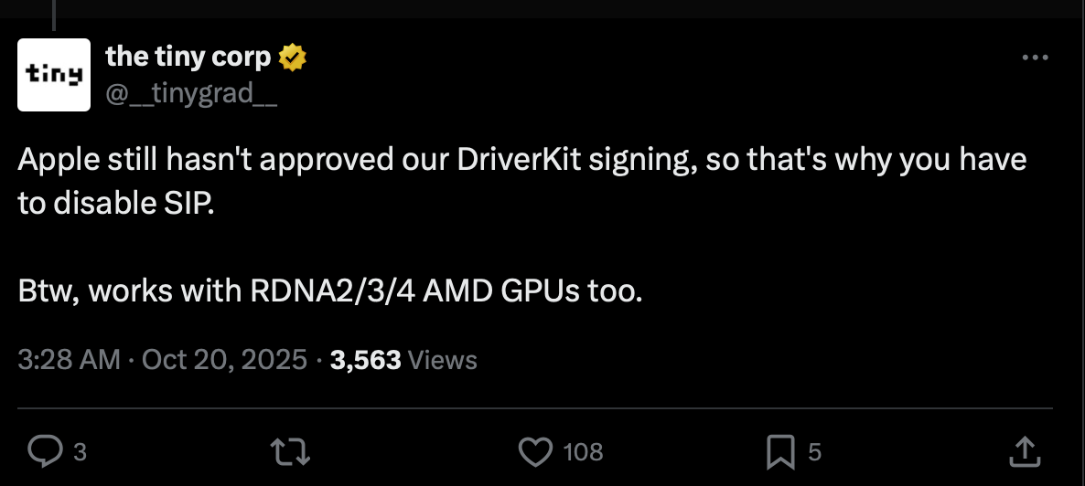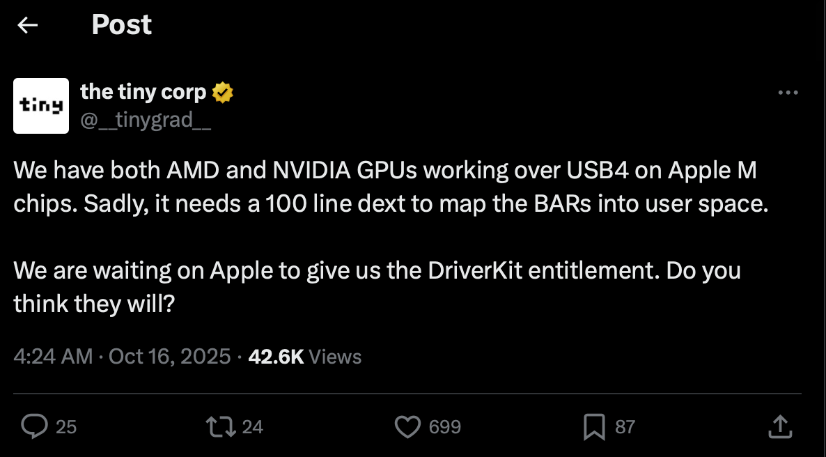 George Hotz TinyCorp delivered a working MacOS driver for Nvidia and AMD video cards that works on Apple Sillicon. Seems to be restricted to their runtime libraries for now. They are waiting for Apple driver entitlement but everyone agrees thats happening when hell freezes.