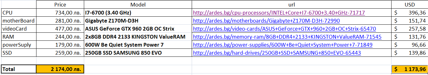 I have found a great deal for the i7 7600 - 346$ the Xeon 1231v3 is almost 100$ more in Bulgaria. And i have switch the video card for a cheaper and with 4GB of vram => GIGABYTE GTX 960 GV-N960WF2OC-4GD. And the RAM sticks will be DDR4 2133MHz 2x8GB CL13 LPX Black.