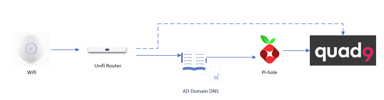 i.e. Client → Unifi DNS → AD DNS → PiHole → Quad9, instead of Client → AD DNS → PiHole → Quad9