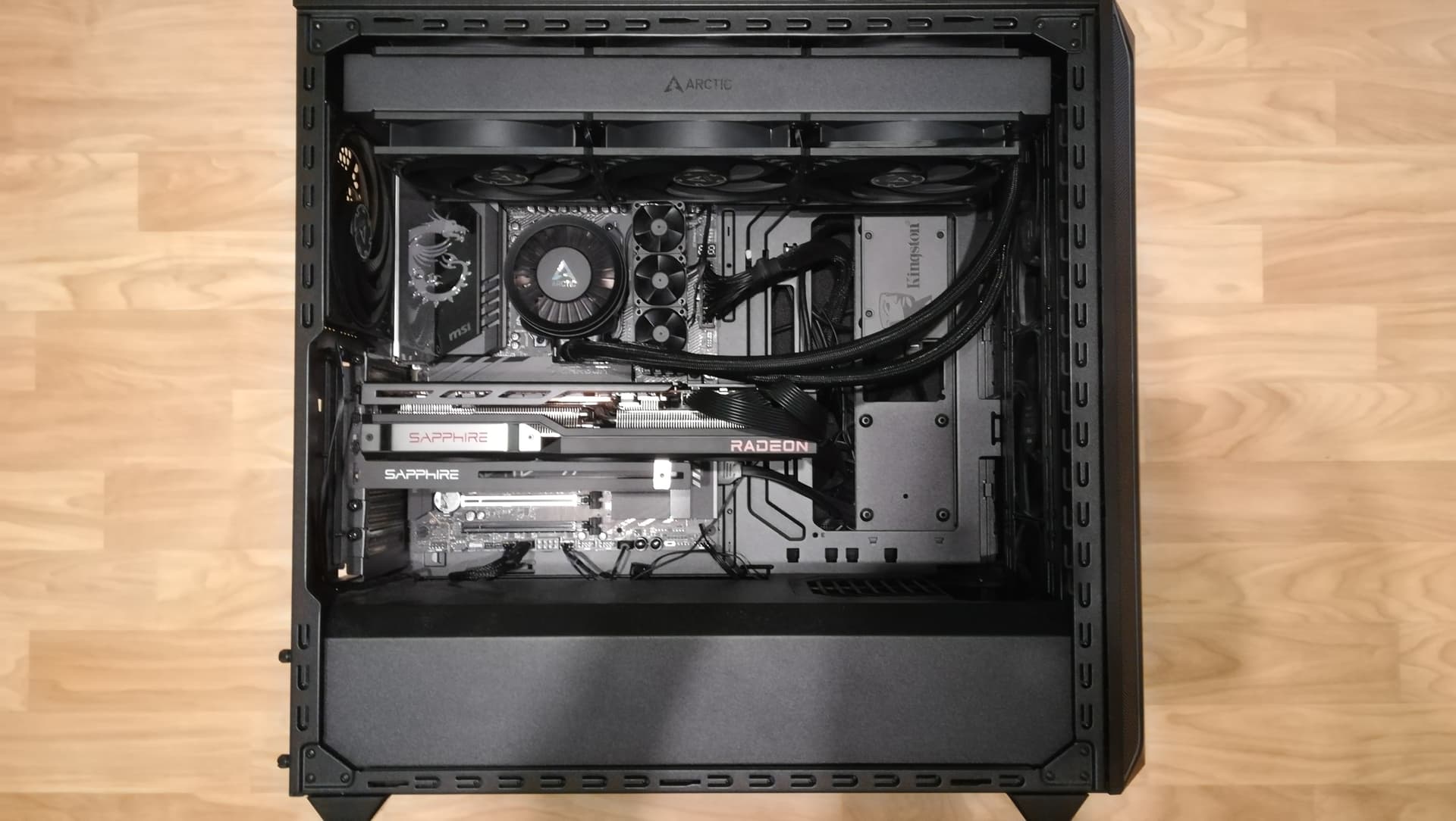 Behold my push pull 420 AIO and RAM cooling solution (3x 6k fans, capped at reasonably quiet 3k). Both AIO and RAM coolers had to be attached by questionable DIY methods, but hey. It works. Besides 3x140 fans in the front, There are also 2x140 hidden fans in the bottom compartment, close to the front ones. There’s way too many fans inside this case. And I like it.