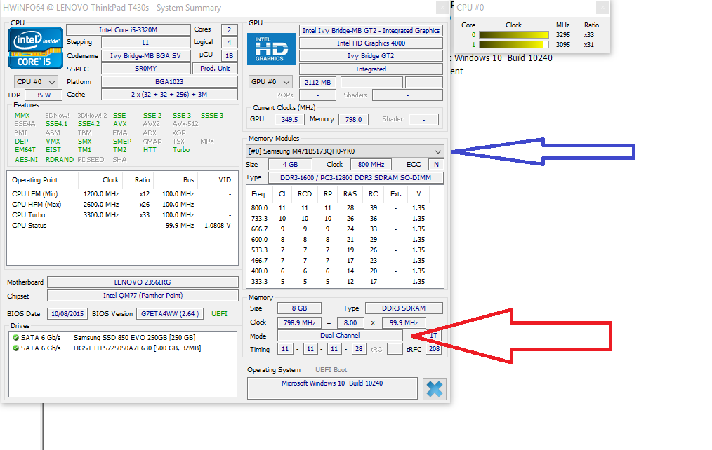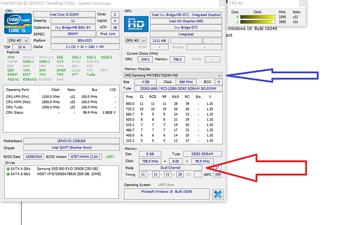 Glad I could help! Huh, 2 slot but not dual channel? I didn't expect that. Here is what mine looks like. The blue arrow is where I can see each of the modules and the red arrow is where it says it's in dual channel mode. Btw, you don't have to have matching RAM blocks for it to run dual channel, mine comes shipped with two different brand SODIMMS, not even at the same voltage. Just the way Lenovo want's it i guess. If you have 2 SODIMMS and that's all the slots available on the Mobo and it's not running dual channel, I'm afraid there is no way to run dual-channel.