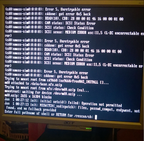 I burned the 9.3 ISO to a CD, but when I try to start the installation on the PC the Grub rescure shows up and tells me "error unknown file system". I tried a few commands I found but sooner or later I get another error with says "no such partition". I even disconected all the drives exept the USB where I want to install FreeNAAS on but it doesn't seem to change anything.