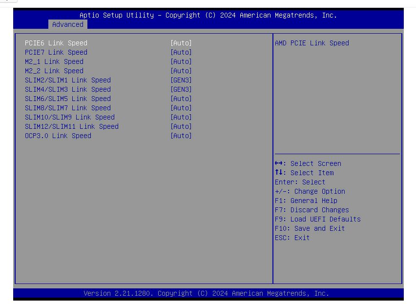 I have tried disabling everything related to SATA in the bios. What is weird is that even leaving aside these two pcie slots, U.2 drives should work with the LP SlimSAS port. I have a SimSAS 8i → 2x U.2 cable but it doesn’t work at all, in any port. The system is supposed to be able to drive 24 pci drives. The ports are all set to x4x4. I tried manually setting the link speed to gen 3 but that doesn’t matter either.