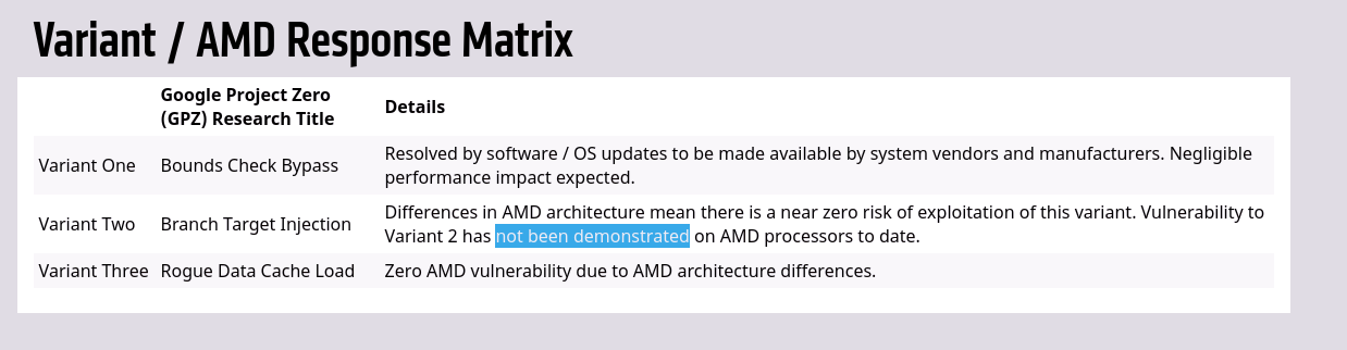 Scroll back up on this thread. I said that from the start even. I personally tried cracking Variant 2 on AMD Hardware and got a partial PoC working. AMD has been careful with the wording since the start.