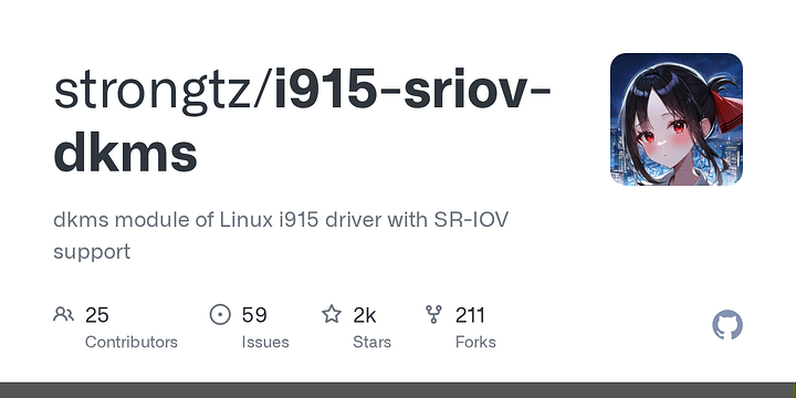 I’m using grub to boot, so I needed to add intel_iommu=on iommu=pt i915.enable_guc=3 i915.max_vfs=7 to the end of my kernel line by adding it to /etc/default/grub . (If you’re using systemd you’ll need to update sysfs.conf instead. ) The lsat two parameters there don’t seem to work anymore, but I know I’ve used them in the past.