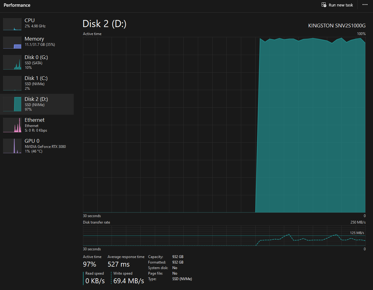You can see here that Disk 2 (the NVMe drive) is maxing out, while the SSD is just wombling along at around 15-20%.