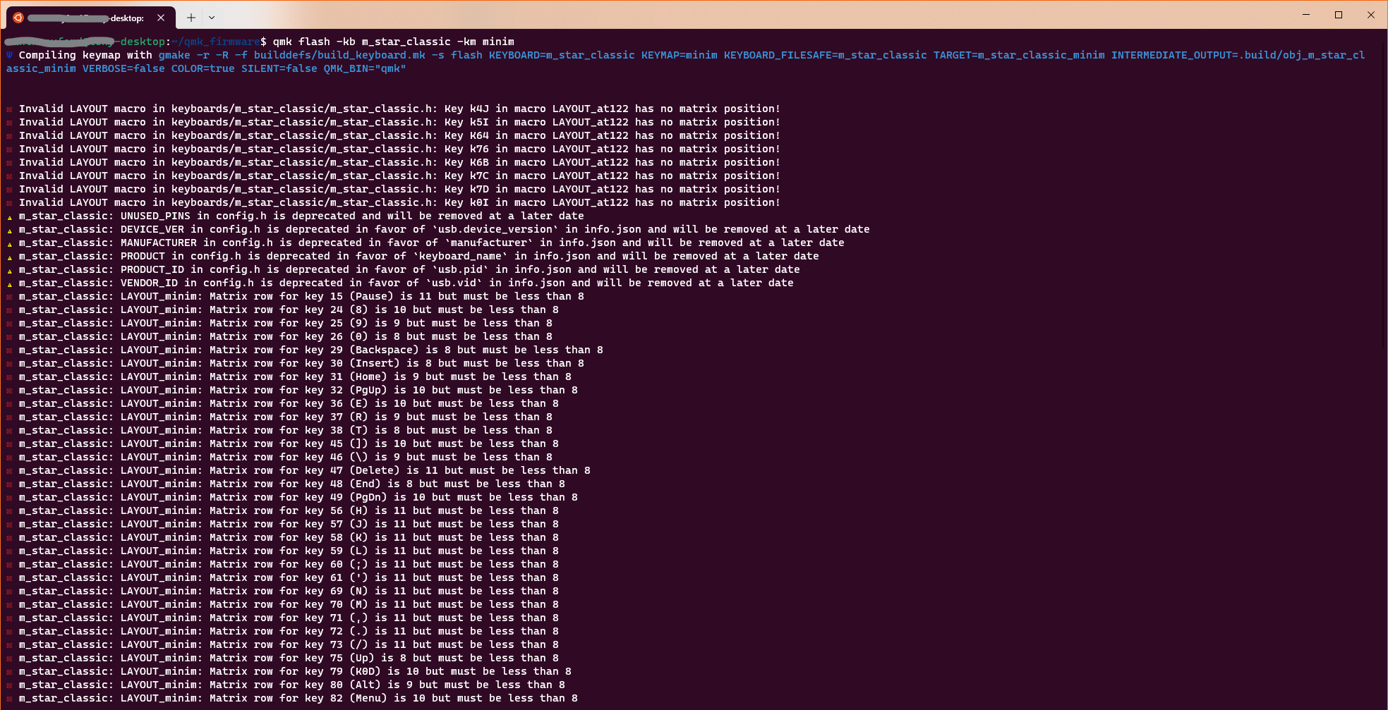 The screenshot below shows the errors I get when I attempt the QMK Flash command (attempting the “minim” keymap first). Also, it wasn’t exactly clear from Eric Raymond’s gitlab where to find the correct source files because some of his documentation references /QMK/m_star-mini but there is no such directory in the repo, but there is an m_star_classic, which seems incorrect or confusing.