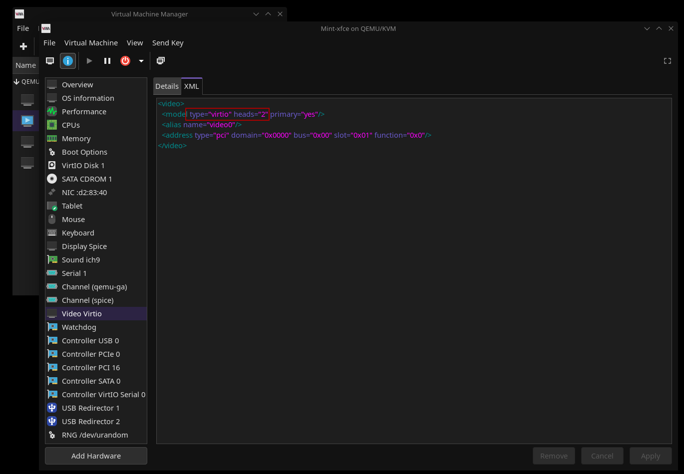 Got it working with Mint. So far everything I’ve googled said I should use QXL and not Virtio, but I decided to take a chance and switched to Virtue and then editing the XML to set head=“2” and now I have 2 virtual displays, extended, and at 1440p.