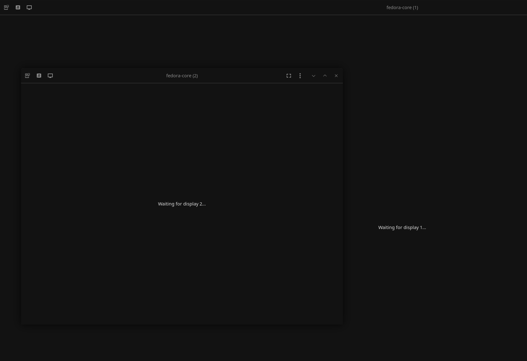 I then tried Fedora and it looks like it’s trying, but as soon as the 2 virtual displays have different sizes it gets stuck on “Waiting for display #” like in the screenshot below. I’ve tried full screen on both “displays” as well with the same result