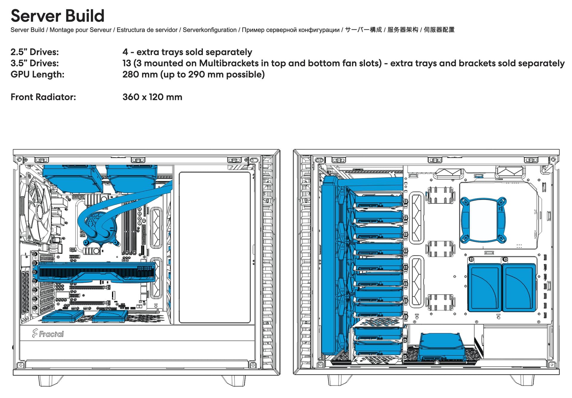 you will notice in this diagram they do not show PSU cables going to any of the drives ; that is because there is actually no possible way to wire up all the drives shown here using standard consumer parts as far as I can tell. No combination of 4x PSU SATA power cables (with 4x connectors each) can connect to all the drives shown. Especially because if you want to connect the 2x drives on the roof, you need a dedicated cable for that due to the distance required. And you need another dedicated cable for your 2x SATA SSD’s on the rear of the motherboard. If you want drives on the PSU shroud, that is another dedicated power cable. Then your remaining cables all need to manage to connect the rest of the drives in the stack and on the floor. I think its just not possible with 4x cables and afaict its only possible with 5x cables if you nix the drives on the PSU shroud and shove the rear SSD’s in between drives in the HDD stacks