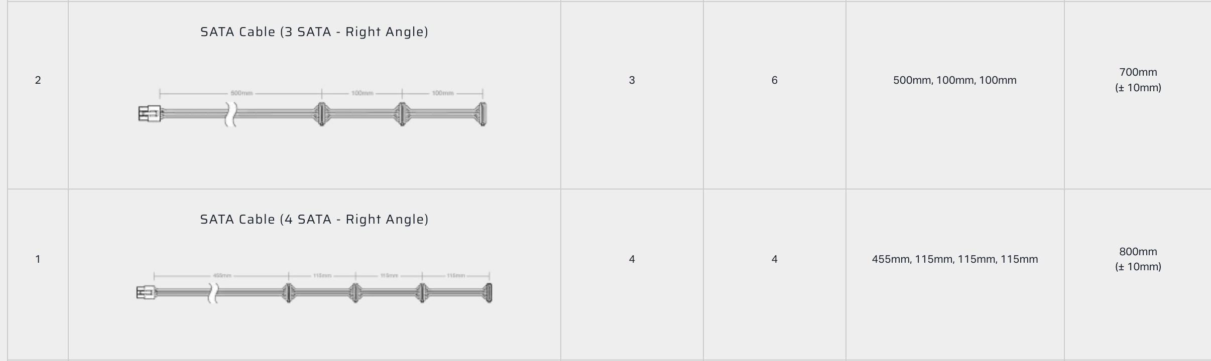 find some reliable third-party (who??) to make 5x custom SATA Power Cables for the PSU which are longer and have far more SATA connectors. The default OEM cables are ~750-800mm with 4x SATA connectors, I was thinking maybe I could get some custom cables that are more like ~900mm with 8-10x SATA connectors each. Not planning to use 8-10x HDD’s per cable, just want extras for more flexibility in cabling