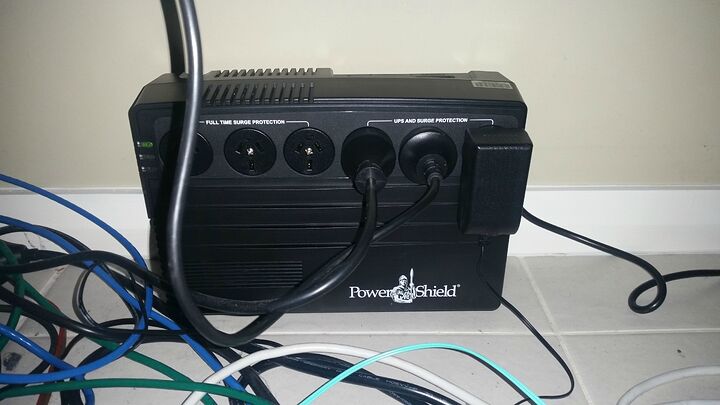 They are four cat6 cables which run from the computer room which contains my servers and router out to the lounge room where everything else is. Two are in a link aggregation group and link the two switches, one goes to the modem which is in the kitchen (where the phone line is) and the other goes to an wireless access point. I use PoE for the modem and access point and have the PoE injectors connected to a UPS in the computer room. But After I initially replaced the cables linking the switches I decided to get rid of those cables too and put a new UPS in the lounge to power the rest of the network.