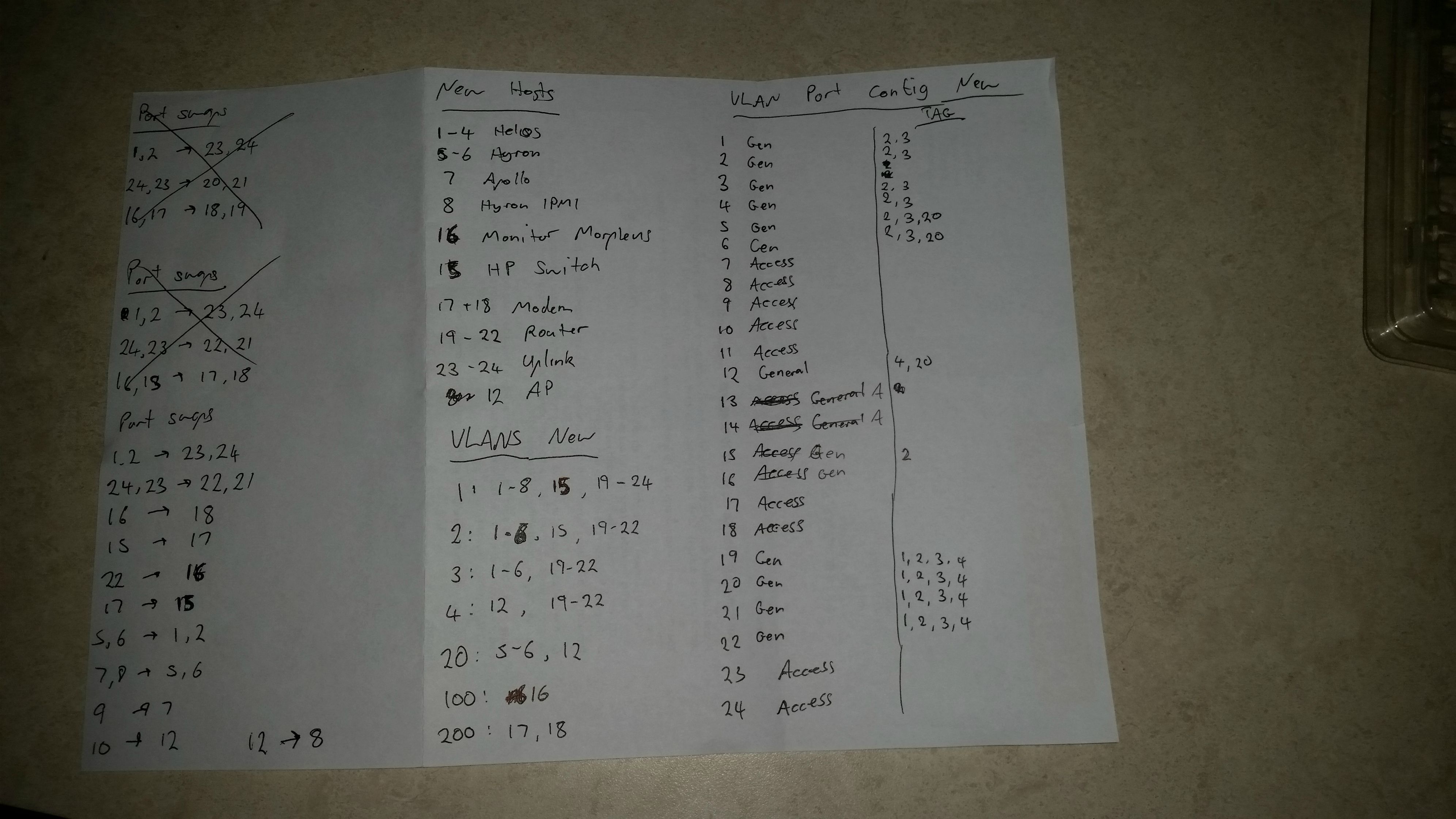 I have recently started using VLANs a lot more, which is how I was able to get rid of the modem and access point cables. Here are some notes I made when initially reconfiguring one of the switches, I’ve changed it a bit since then but you can see sort of how the VLANs are set up.
