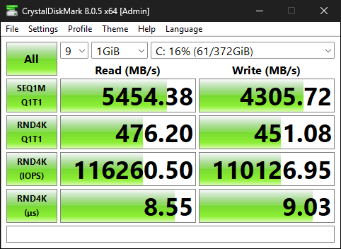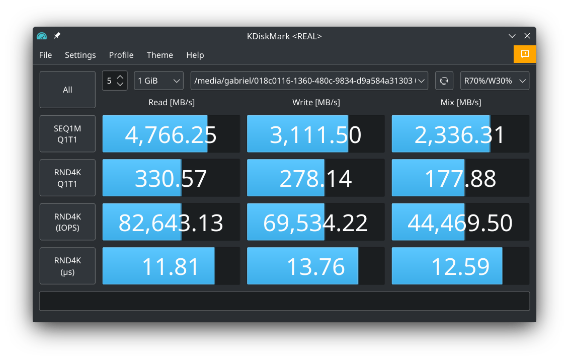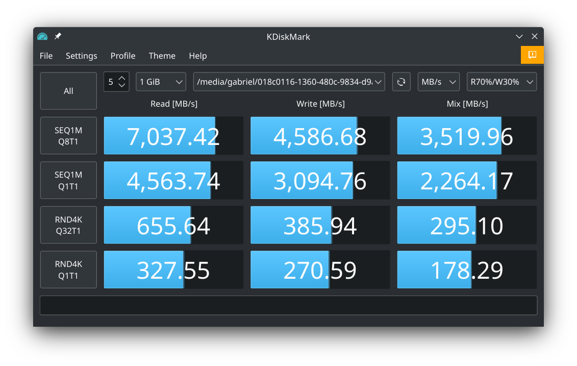 These are my CDM benchmarks. Indeed the 4KQ1T1 of my PC are quite a bit lower, but I am not sure that explains my not-so-fast (nearly) sequential speeds in “real world” file transfers (using a file manager or even cp in the terminal) in Linux.