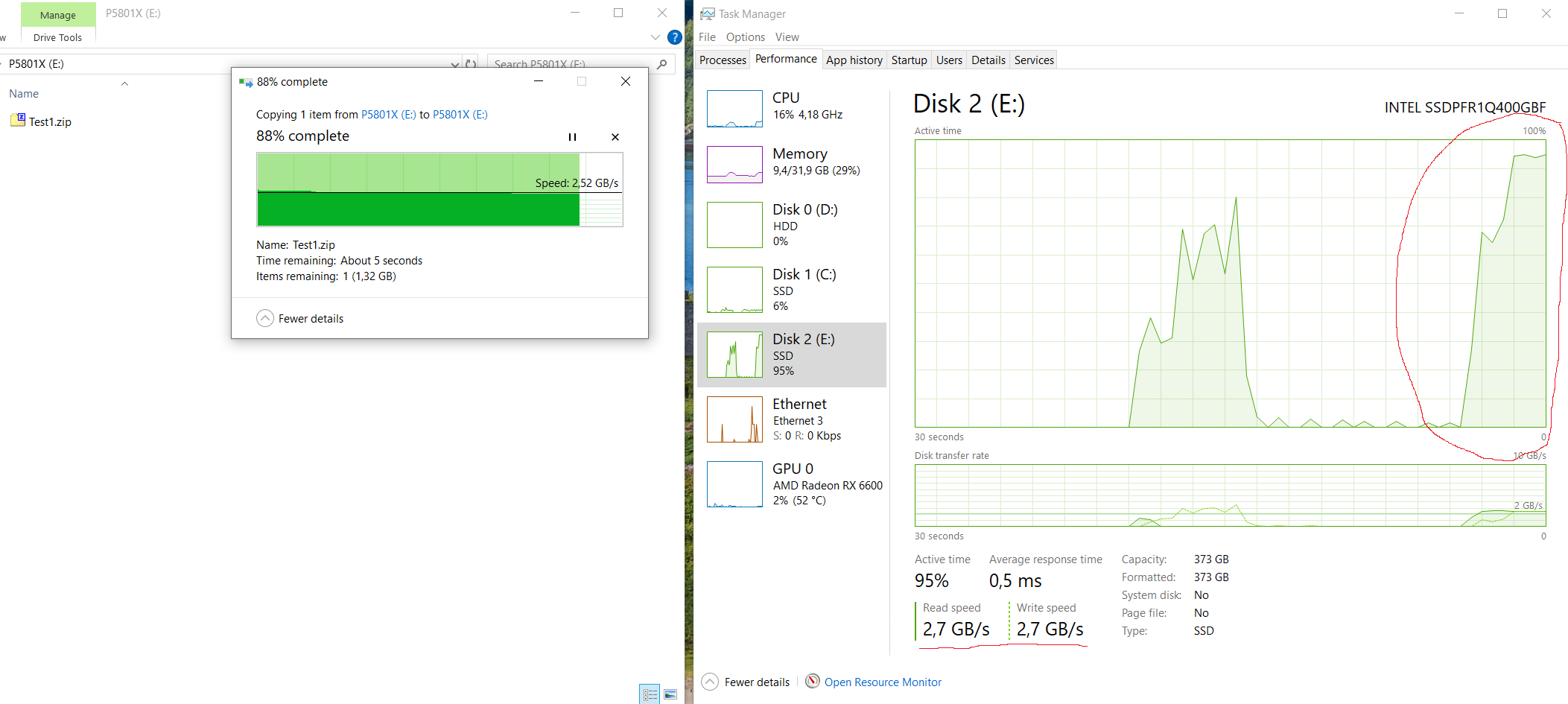 Finally, here is the performance in Windows 10 (formatted in NTFS), with a copy of a 12GB ZIP file from the P5801X to itself using Windows Explorer with around 2.5 GB/s throughput: