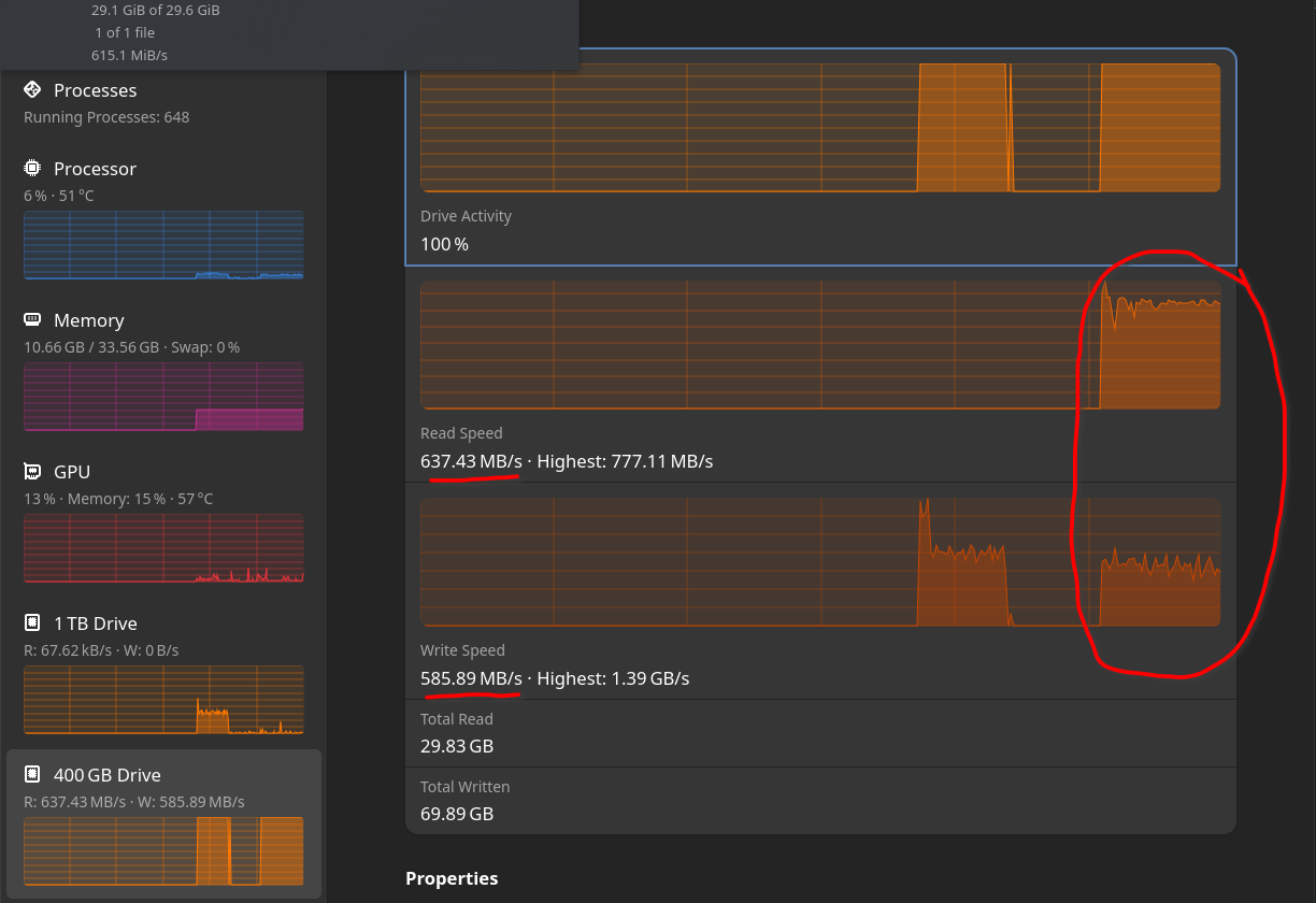 Firstly a copy of a 30GB ZIP file from the P5801X to itself using Dolphin with around 600 MB/s throughput: