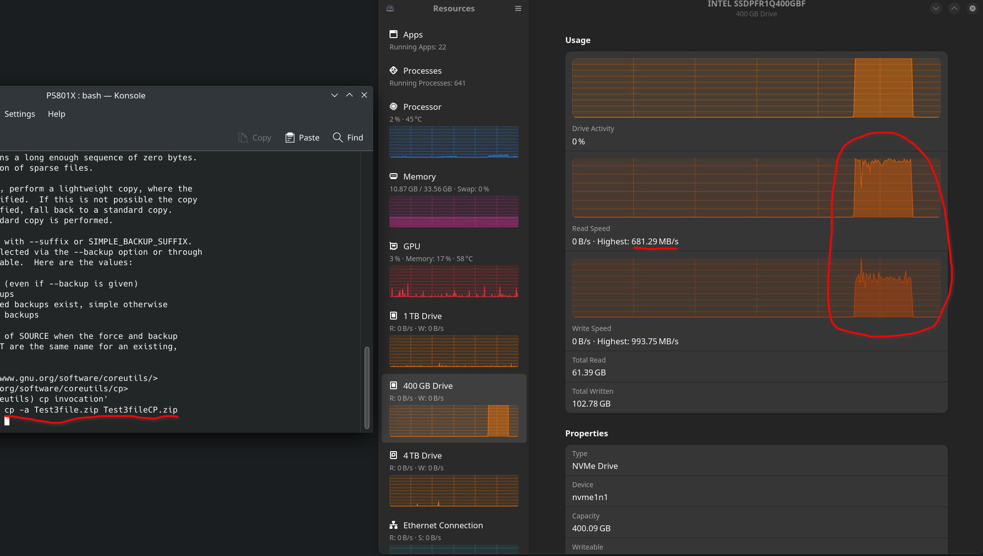 Then a copy of the same 30GB ZIP file from the P5801X to itself using cp in the terminal with around 650 MB/s throughput: