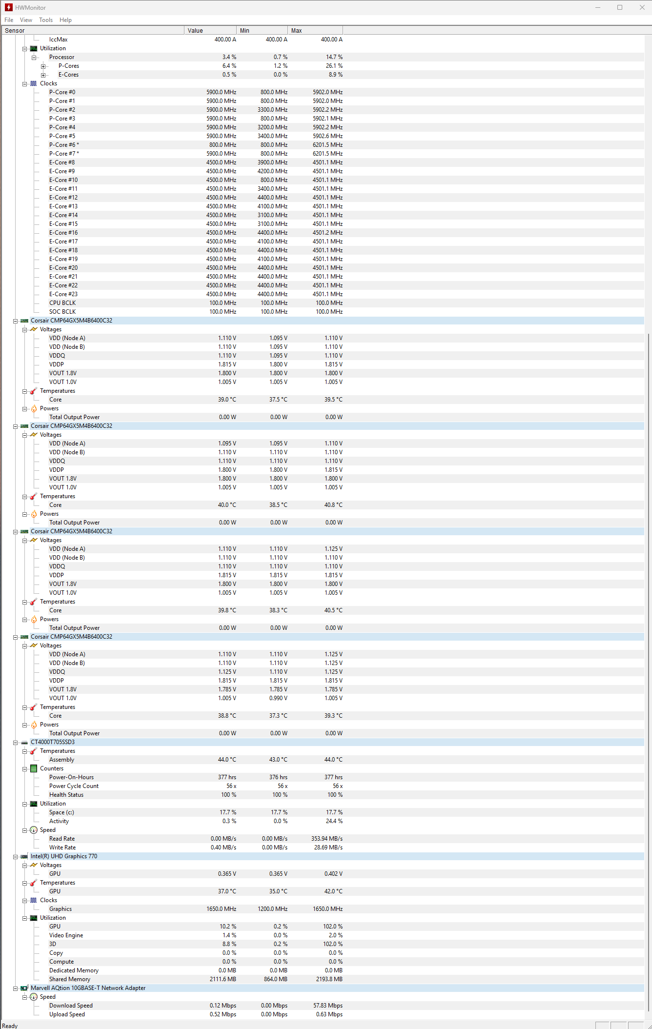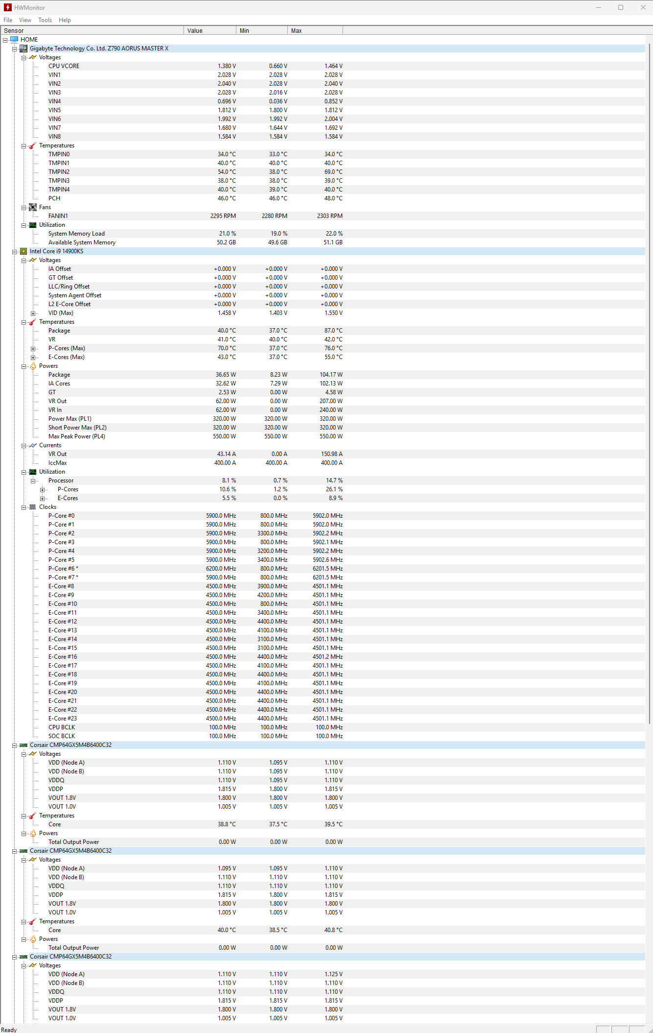 I will repeat these tests with the new PSU, as long as all else works as expected… I’m also attaching some screenshots from the HWMonitor tools for the i9-14900KS system (no GPU)