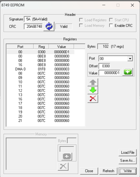 I have attempted modifying the EEPROM of the PEX8749 In order to get x4 x4 x4 x4 x4 x4 x4 x4 : Port 00 Offset 300h Value 00000121