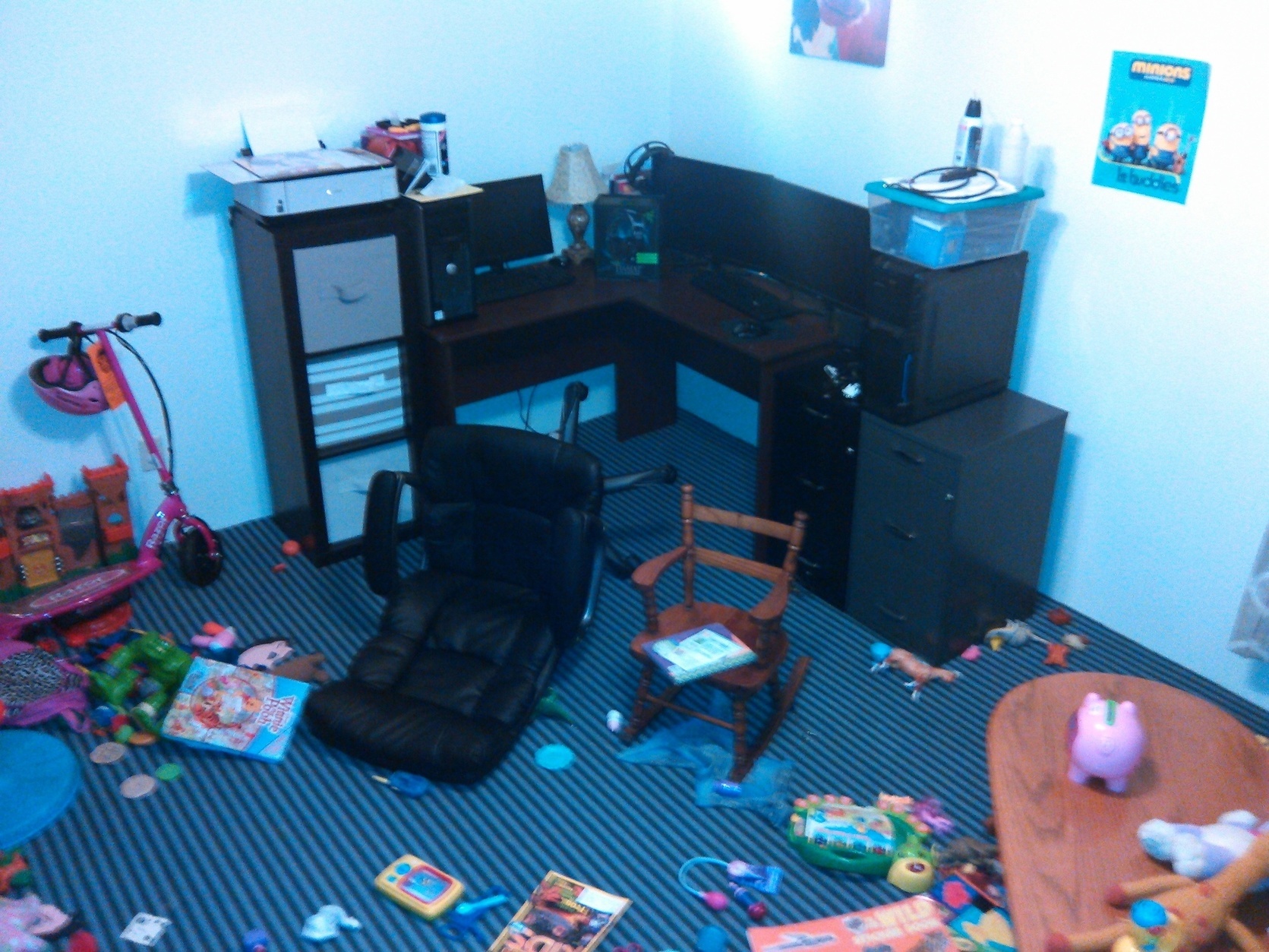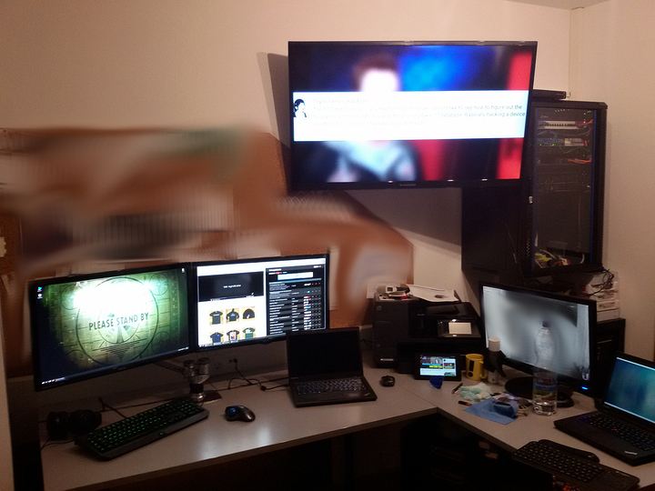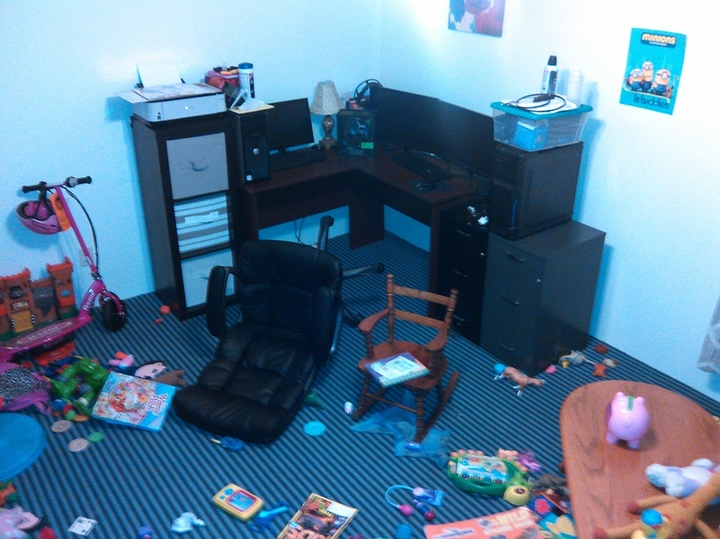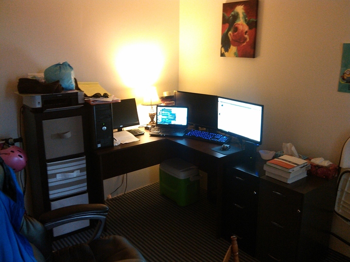 My current work are without my desktop due to waiting on a CPU. Yes I share my computer area with the girlfriend a 5 year old and a 2 year old. And yes all the computers here are owned by myself and there are 3 other laptops missing from the photo.