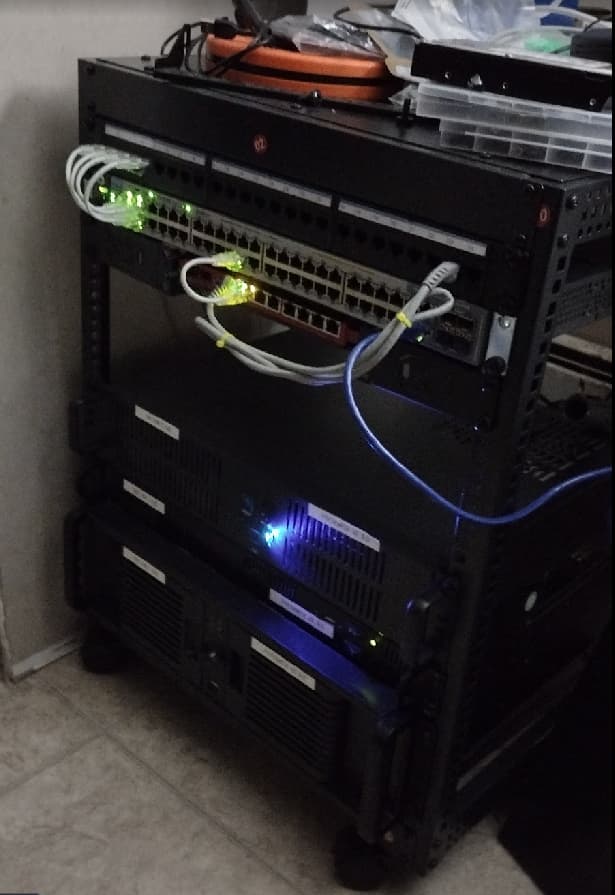 I decided to leverage my large collection of older machines, a few select “new” used parts from ebay and one brand new piece to build a proper rack in a dedicated room in the back of the house. The new stack includes Server #1: a Ryzen 3900X with a matched 128gb QVL’d DDR4 kit with 4TB of NVME and 2x 20TB Refurb EXOS in Raid 1. GPU is an old OEM Dell GTX750 just to have a display out. This machine takes over “Main server” duty and runs the majority of my VMs including Primary NAS. Server #2 is an i5-9600t with 64GB DDR4, 1tb NVME, and 3x 12TB HGSTs pulled from the old server (2x12 in Raid 0, 1x12 for NVR). This server functions as my backup NAS and NVR server. Server #3 is a Celeron J1900 with 16GB DDR4 that lives just to run my discord bots. There’s also an HPE 48 port PoE switch, and a Mikrotik Router.