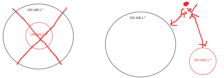 Or another way of looking at is is that the subnet 192.168.11.* is running WITHIN the main subnet of 192.168.1.*.