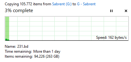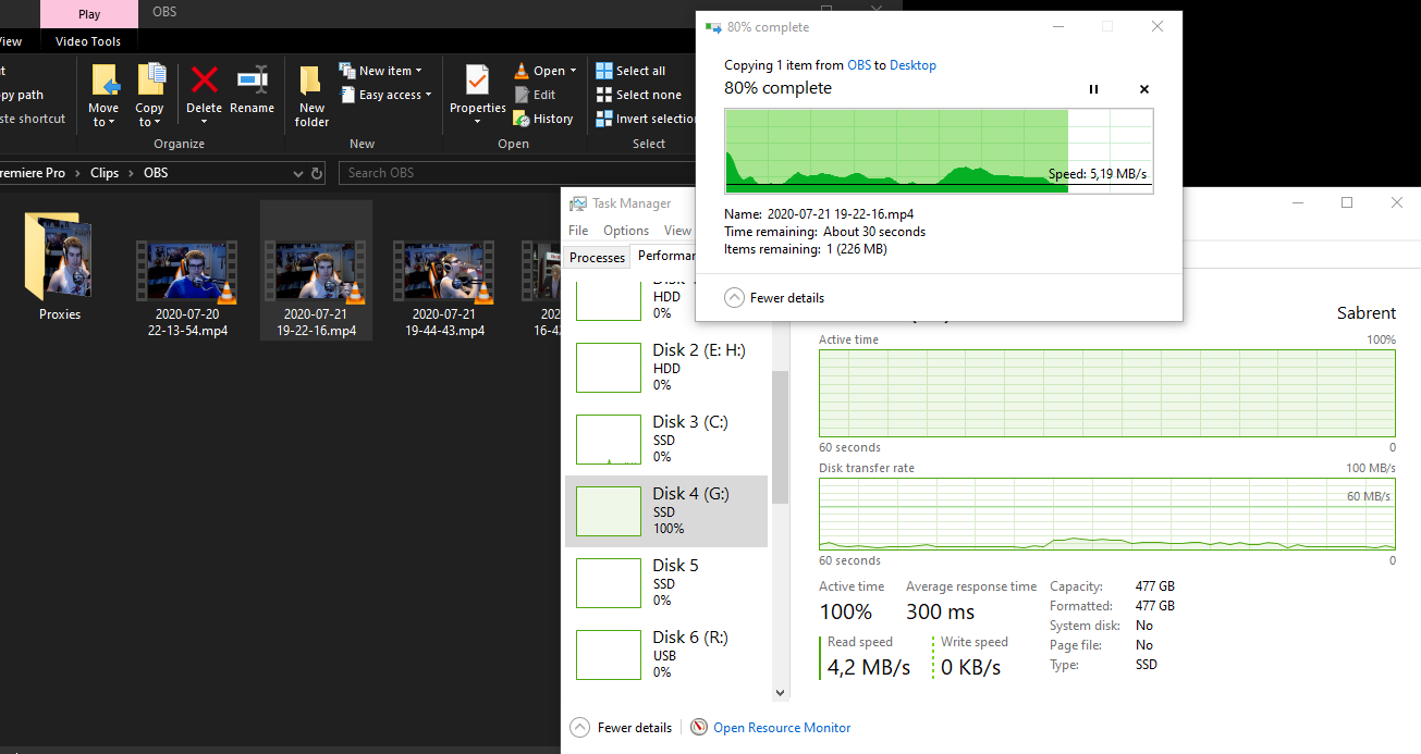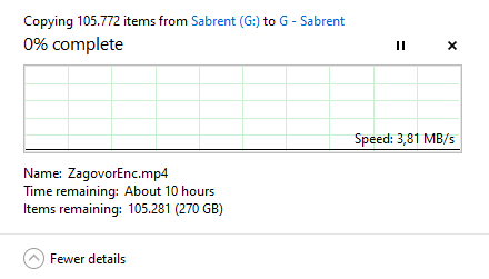 The read speeds are incredibly bad (And the files are mainly just 0.5 - 2GB .mp4’s). The weird thing as well is that CrystalDiskMark speed test shows proper numbers. (Transferring to other local SSD’s/HDD’s is also affected)