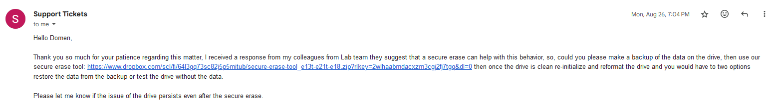 Thank you so much for your patience regarding this matter, I received a response from my colleagues from Lab team they suggest that a secure erase can help with this behavior, so, could you please make a backup of the data on the drive, then use our secure erase tool: Dropbox then once the drive is clean re-initialize and reformat the drive and you would have to two options restore the data from the backup or test the drive without the data.