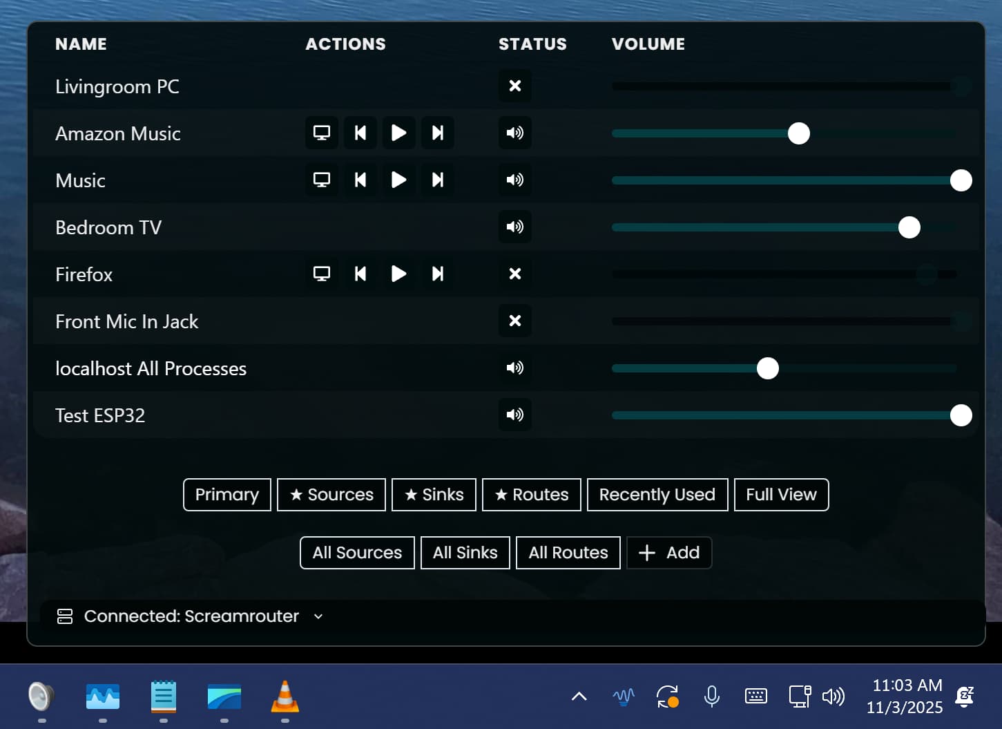 Hey. I’ve been a VFIO/Scream Audio Driver user for years. A few weeks ago I had an idea to make a mixer/router that allows configuring many to many sink<->source setups. After a few weeks this is what I have.