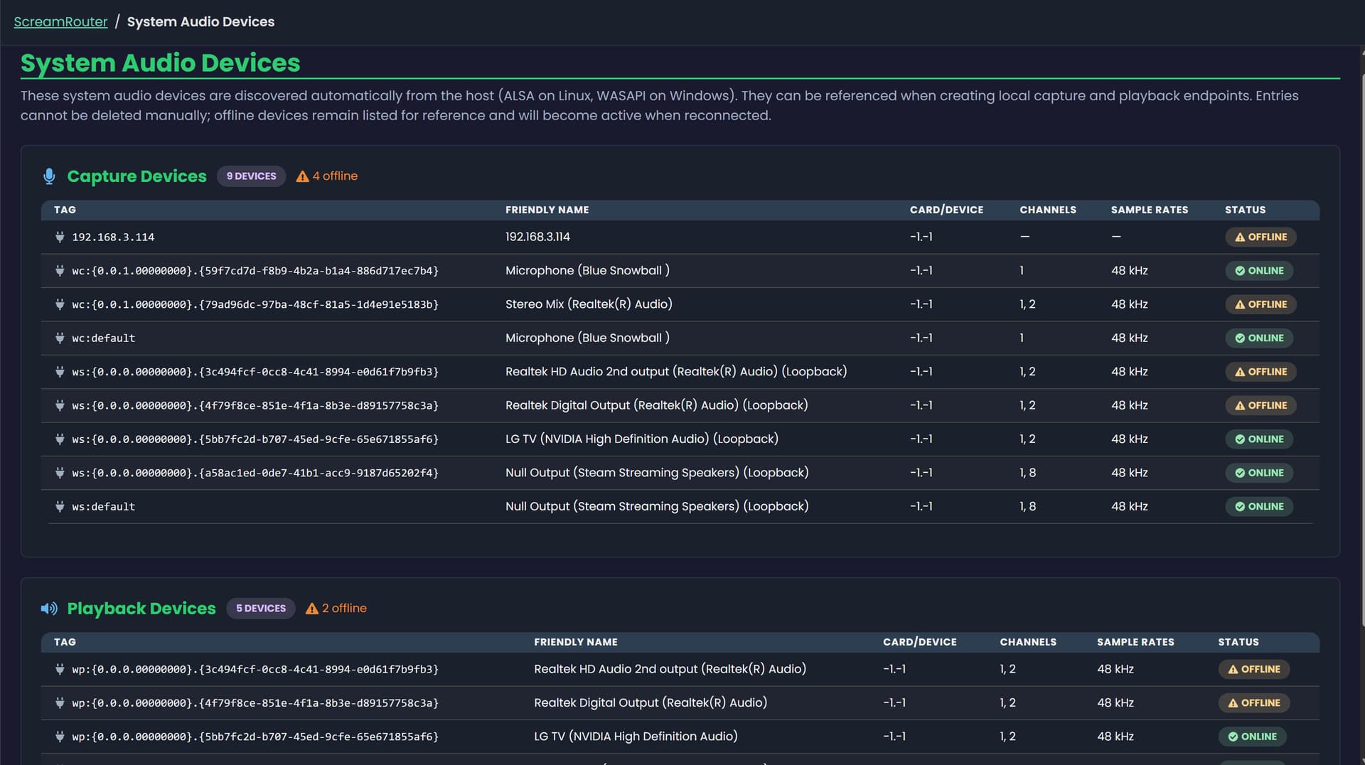 ScreamRouter can now capture audio from ALSA and WASAPI inputs, output to ALSA and WASAPI outputs, and provides a PulseAudio emulation layer so libpulse applications can directly play to ScreamRouter.