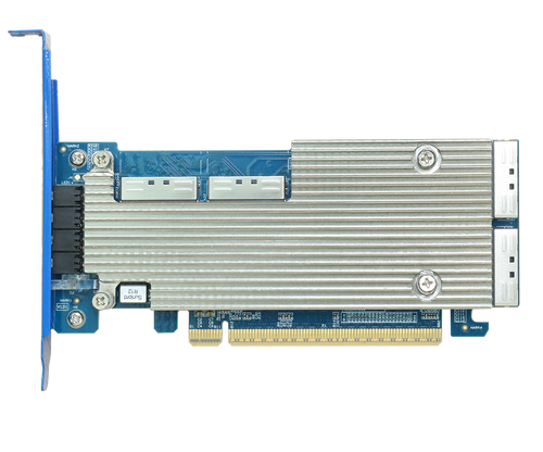 For an active device, this one takes PCIE 4.0 x8 lanes and converts it into either 16 slimSAS lanes or 24 SlimSAS lanes which you can use to connect 4 or 6 NVME drives directly to: