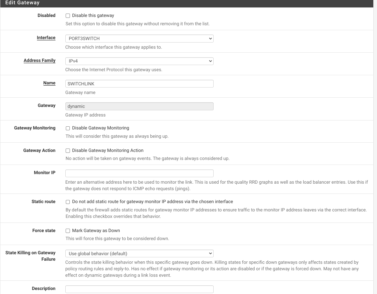 EDIT: I see some Ubiquity switches are L3, if that is your setup, then change PORT3SWITCH gateway from Dynamic to 192.168.2.1 and make sure the firewall is set to something on the same subnet, like 192.168.2.2. To avoid confusion down the road, I suggest using a local-link address for the link between the switch and firewall, so the firewall might be 169.254.1.1/30 and the switch would be 169.254.1.2/30, then the PFsense gateway would be set to the switch, 169.254.1.2 and you can forward 10.0.0.0/8 traffic to that gateway…again, assuming you have a L3 switch.