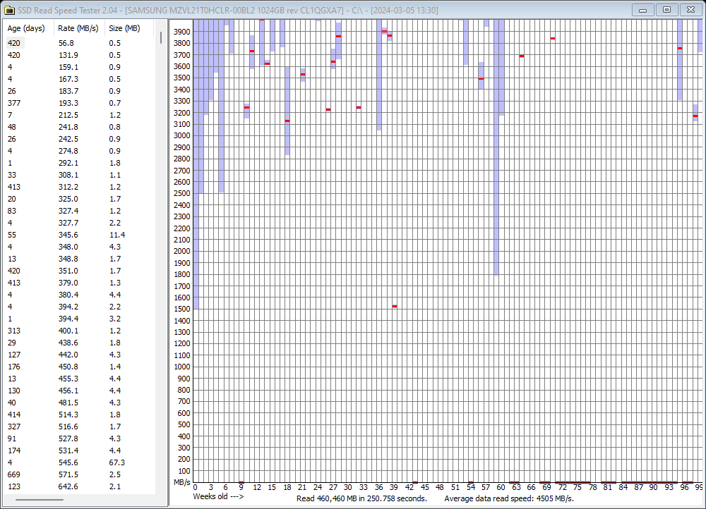Note how file age doesn’t seem to correlate with speed, and the average read speed at the bottom right is quite close to the drive’s rating. And this is after just over 1 year of daily 8-hour use (work laptop).