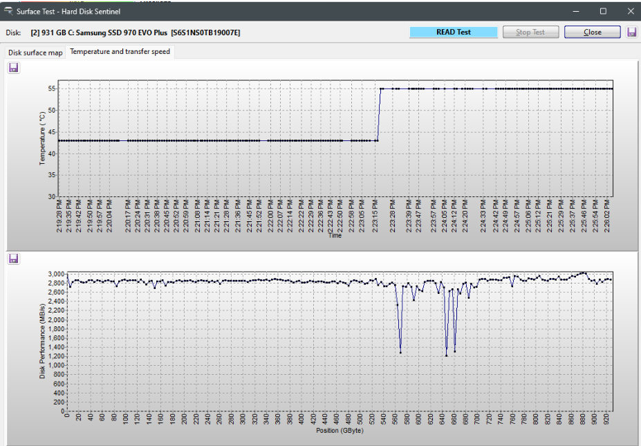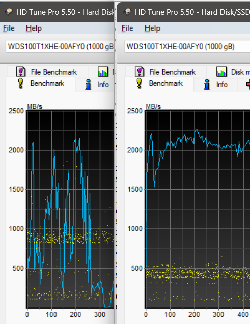 Also, so far the ONLY drive I have measured that did not exhibit this phenomenon is a SATA Crucial MX500 1TB, that bad boy is always a rock-solid straight line across the whole span at max speed, despite having a good chunk of the data onboard sitting for upwards of a year now.