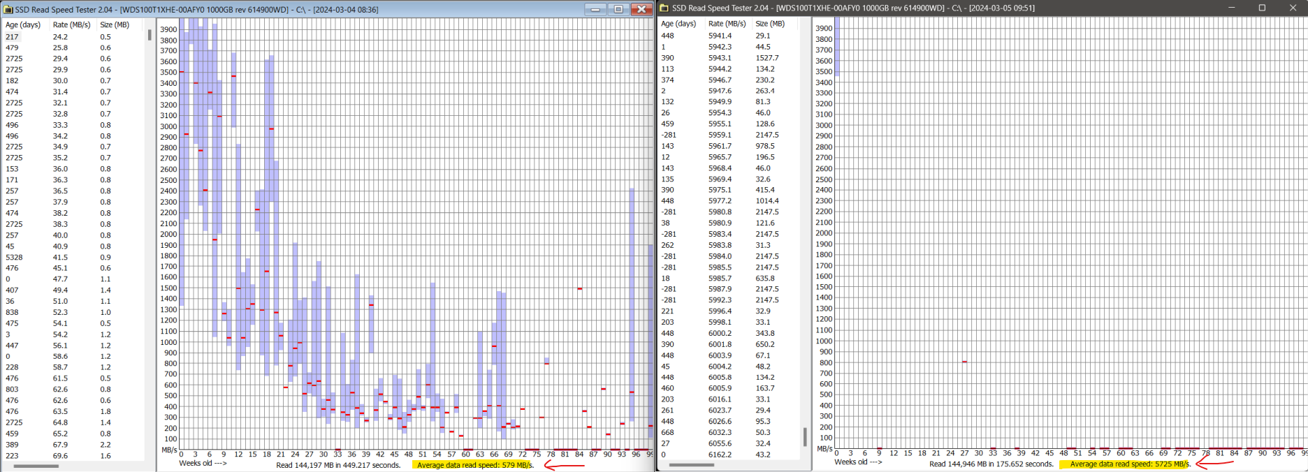 The utility all the way back in post #5 was measuring read speed per file, and then corelating it to the reported age of the file (NTFS timestamps), there was definitely speed degregation associated with age but the problem with that test is that it was done on many different files of different sizes and there was no accounting for the size of the file affecting the read speed. The left-most pane of the test does show individual files and their size and speed, but size isn’t reflected on the graph.