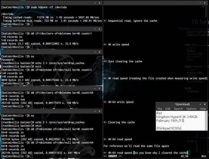 Guess it's time for me to learn more about I/O, haven't played with storage devices much, and since I can't run AS SSD or ATTO I'll do manual tests (sorry lol) and ask a question. All the benchmarks display the result of one testrun, so I ran the commands several times, and those numbers shown in the results are pretty average, and seems to make sense. Indeed not the fastest but I'm running an old crummy laptop after getting rid of my desktop a while back (was overkill lol).