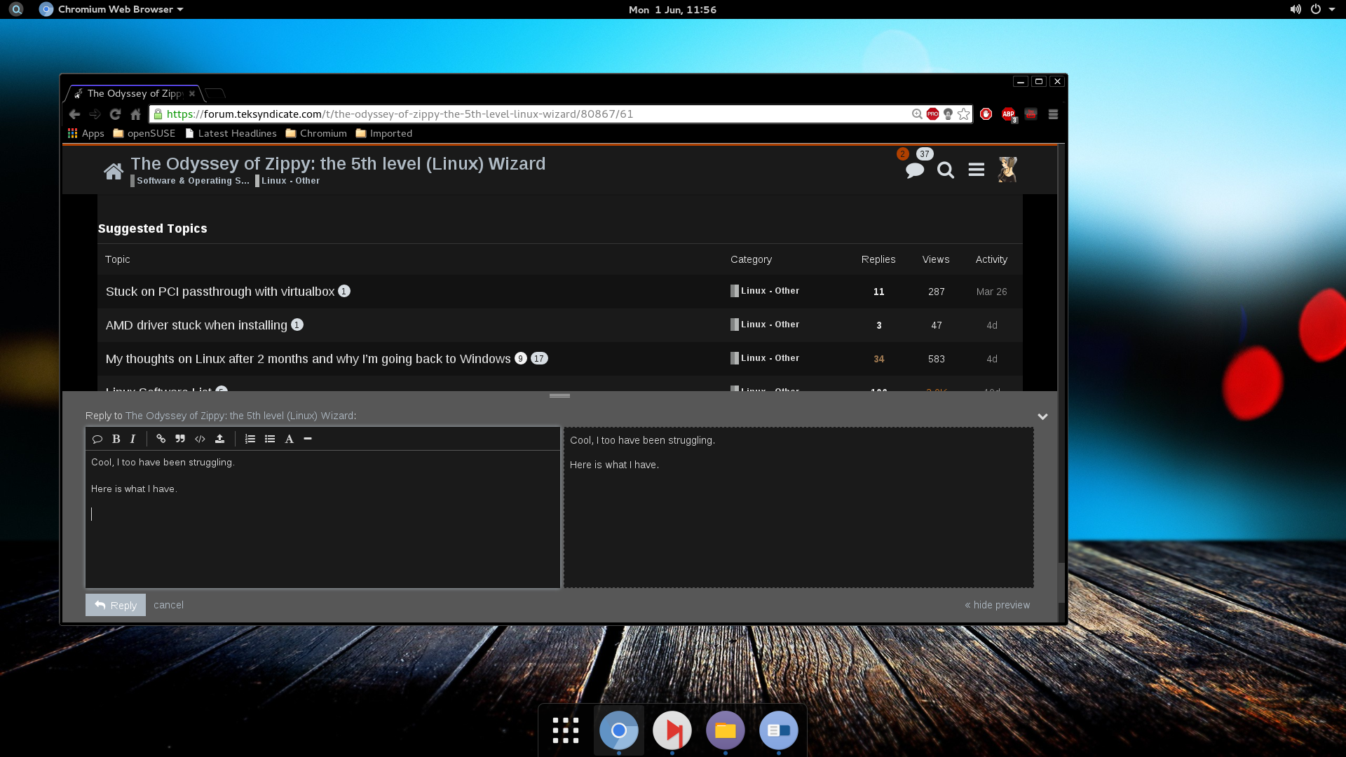 Love Cairo dock but it wasn't it the SUSE repos. Plank is !minimalistic. I think it uses gtk instead of qt though. It's minimal and I like minimal. The widgets with plasma haven't been updated and probably won't be until 5.4 in August. As a matter of fact qt 5.4 is already out...