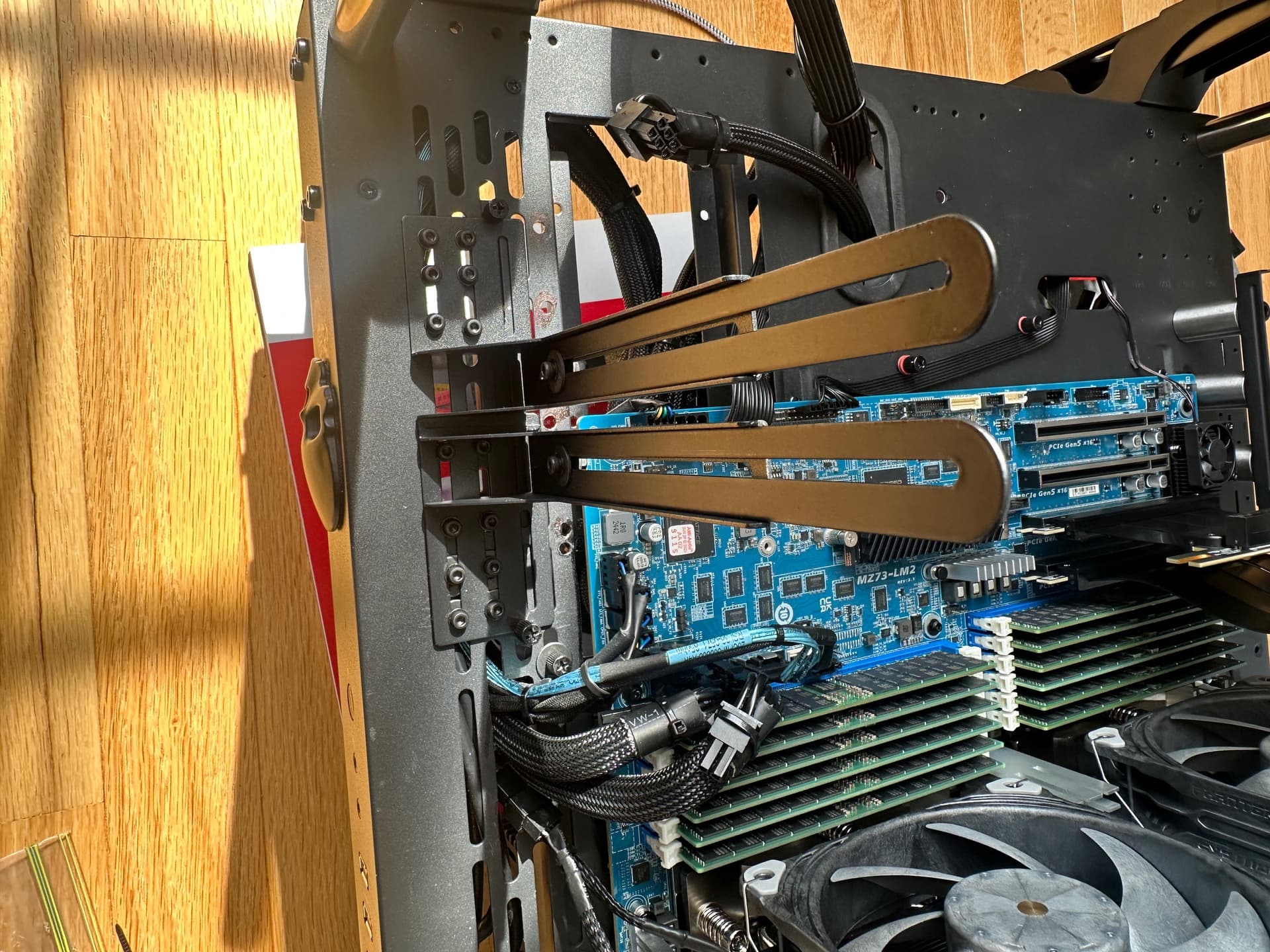 So I had to come up with a better design. I did not want the hot air from the cards blowing onto the dual CPUs and ram and I did not want the video cards to blow hot air down to the motherboard.