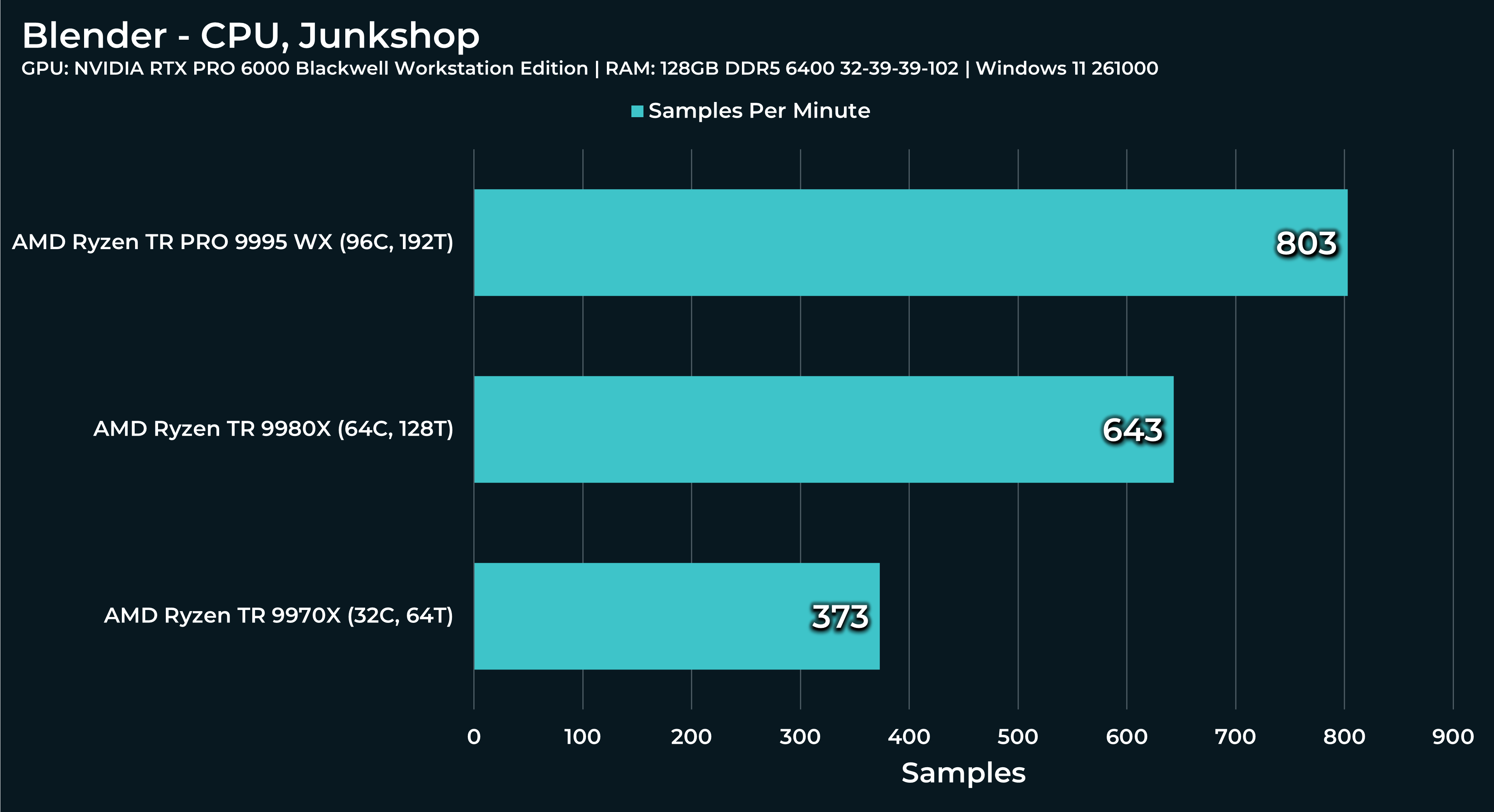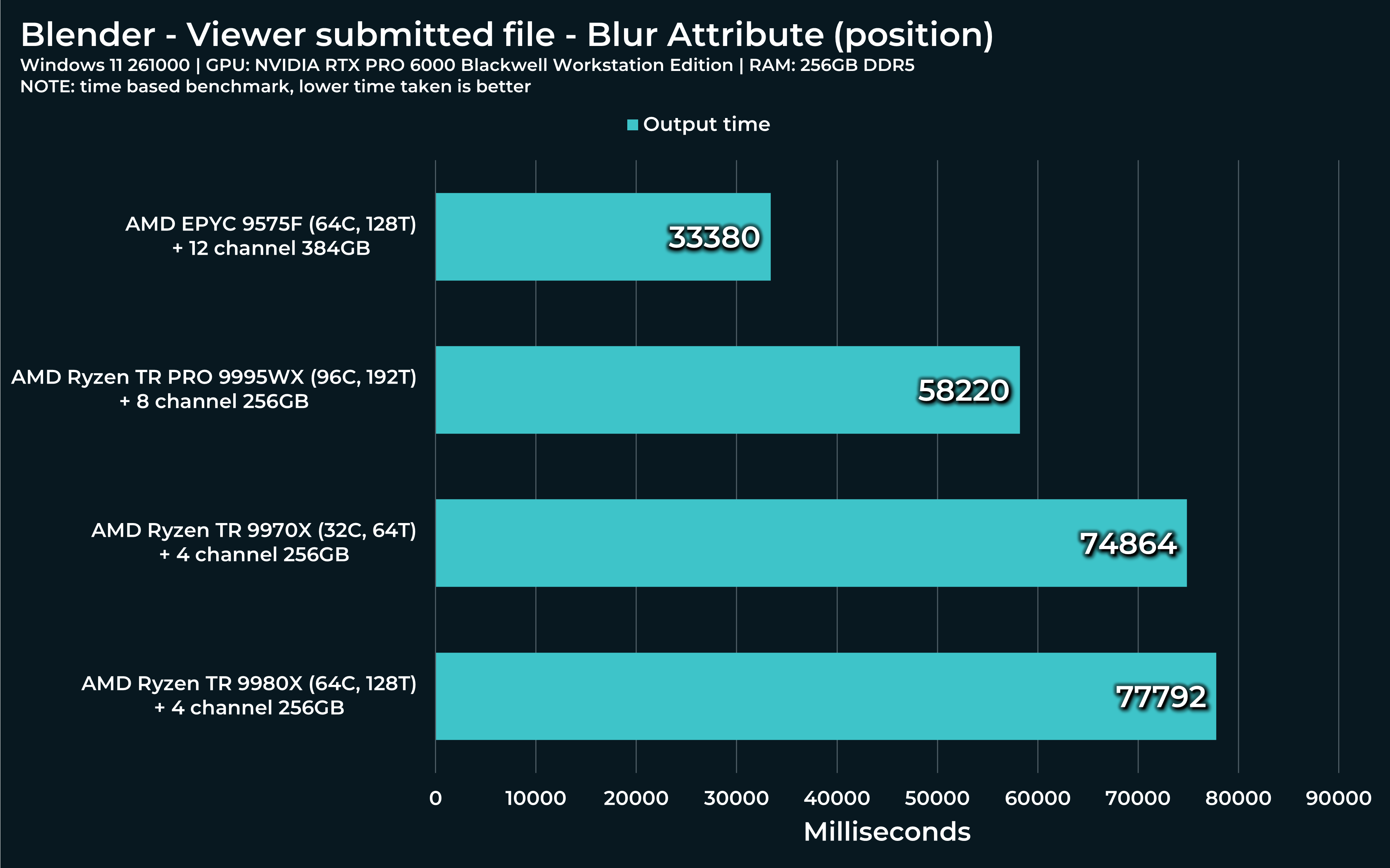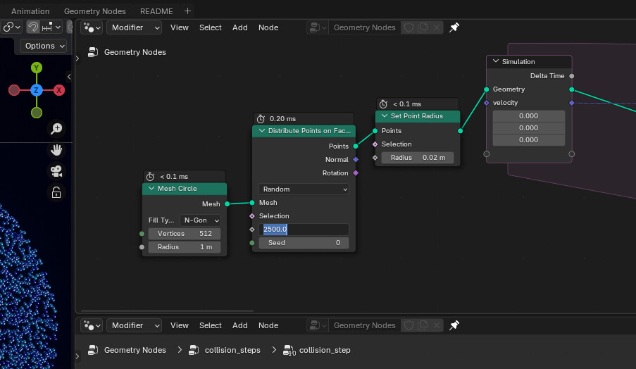 At the top Geometry node window, you’ll see Distribute Points on Faces node, second from the left. The default value is 2500. After you run this, change it to 20 000. Run the simulation from the beginning again. I’d like to know how Threadripper’s performance will vary.