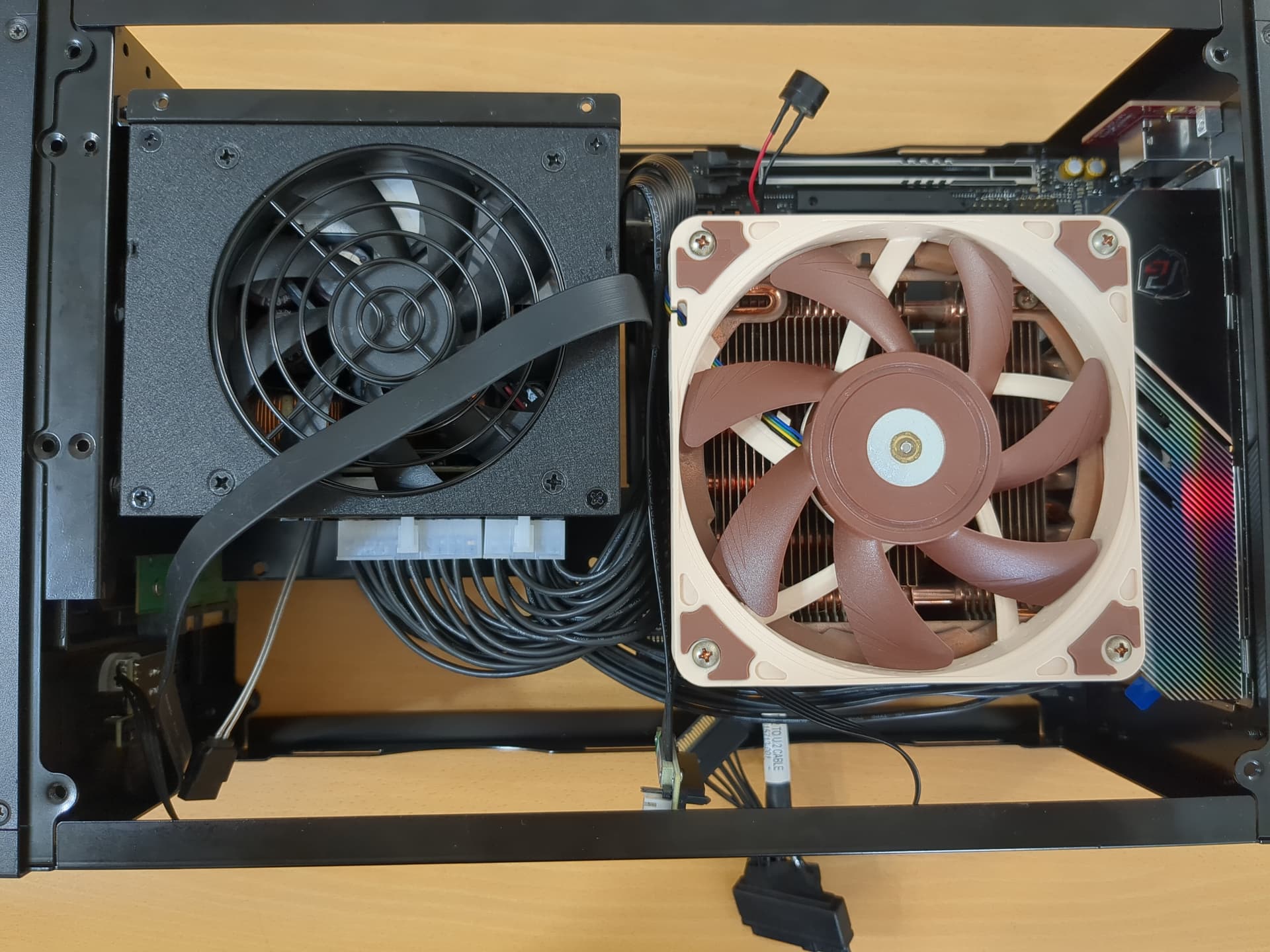 Turns out, there’s too much cable in this configuration, even with custom cable length, and the exhaust path is not efficient (block by VRM heatsink). Thus, I flip the layout, mount 905p at 25 mm fan side and use 15 mm fans for exhaust.
