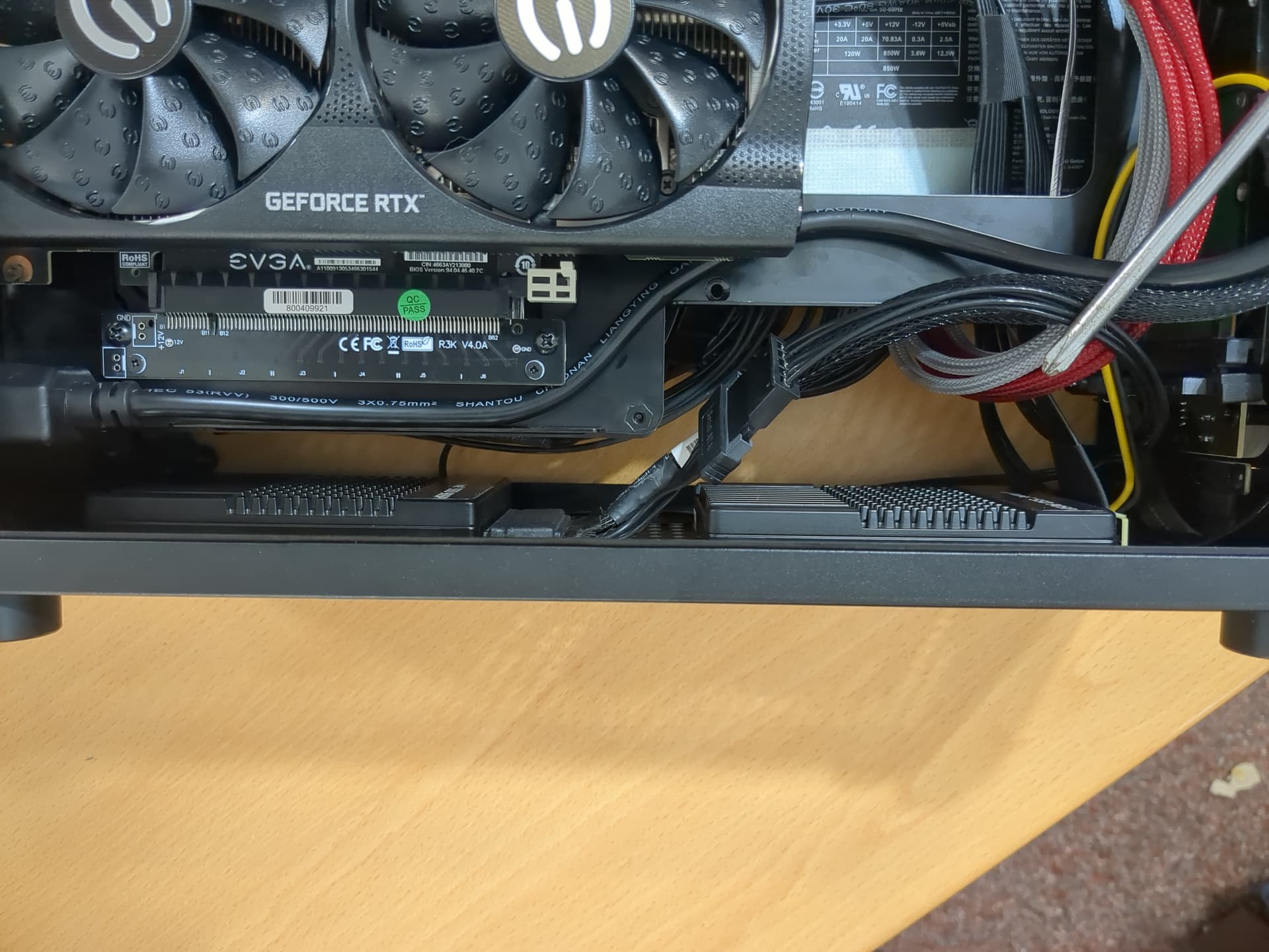 Because the original 2.5" / 3.5" drive bay is empty, I figure I could put an HDD just for fun. Also, GPU with flow through design is becoming normed. I also offset the PSU with brass standoffs. Here I’m using 3060ti xc, which is what I have and it’s perfectly okay. If I want to upgrade to bigger GPU I can, and I don’t have to re-adjust PSU again.
