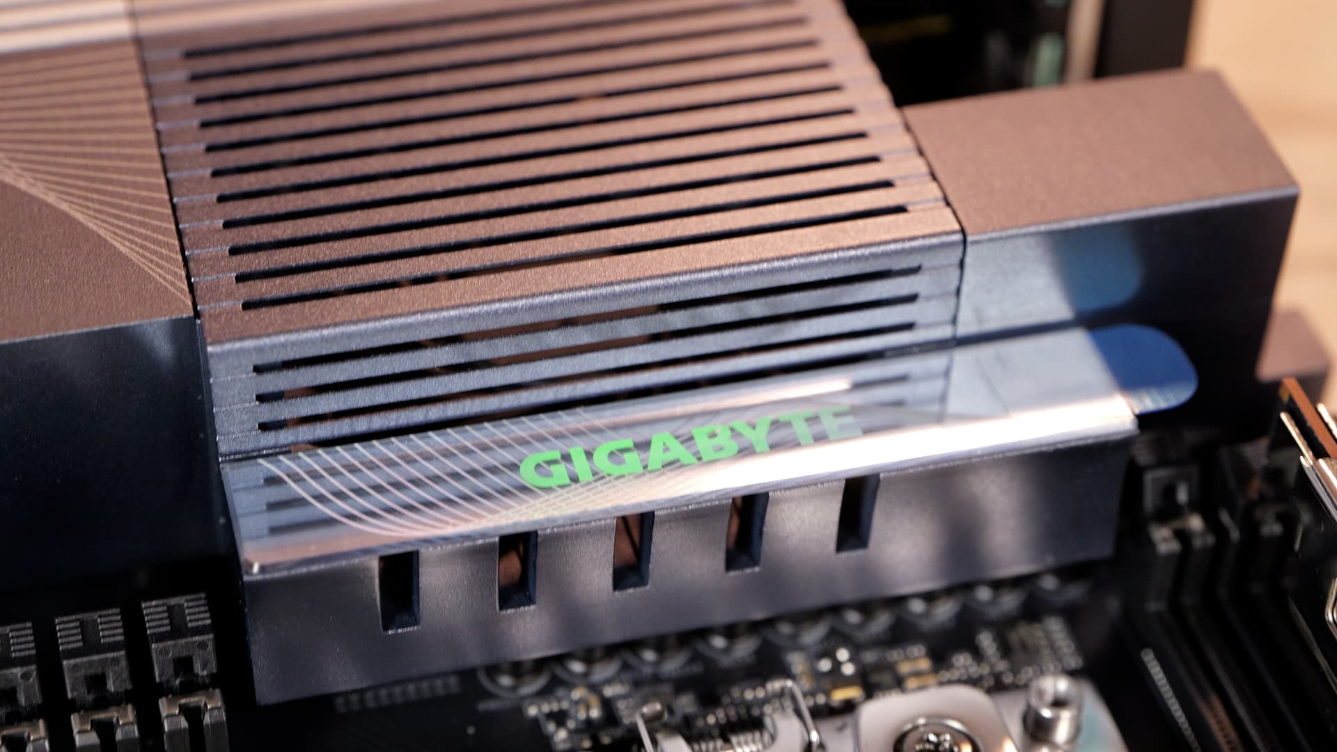 The rear IO is fairly typical, but I want to draw attention to the 10G connections at the back. These are connected to a Marvell 10G chipset and are fastened to the rear heatsink assembly, which has a fan to help with cooling. This assures that it won’t overheat and cause connection loss, or cause a loss of bandwith. This is something that a lot of other TRX 50 and WRX 90 motherboards have not figured out, so good work Gigabyte. There’s also plenty of room for airflow over your DIMMs, which is nice to see.