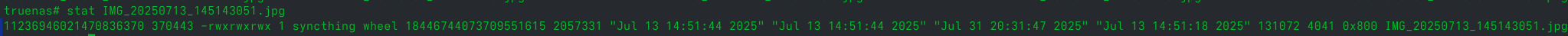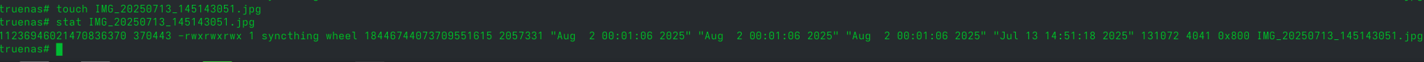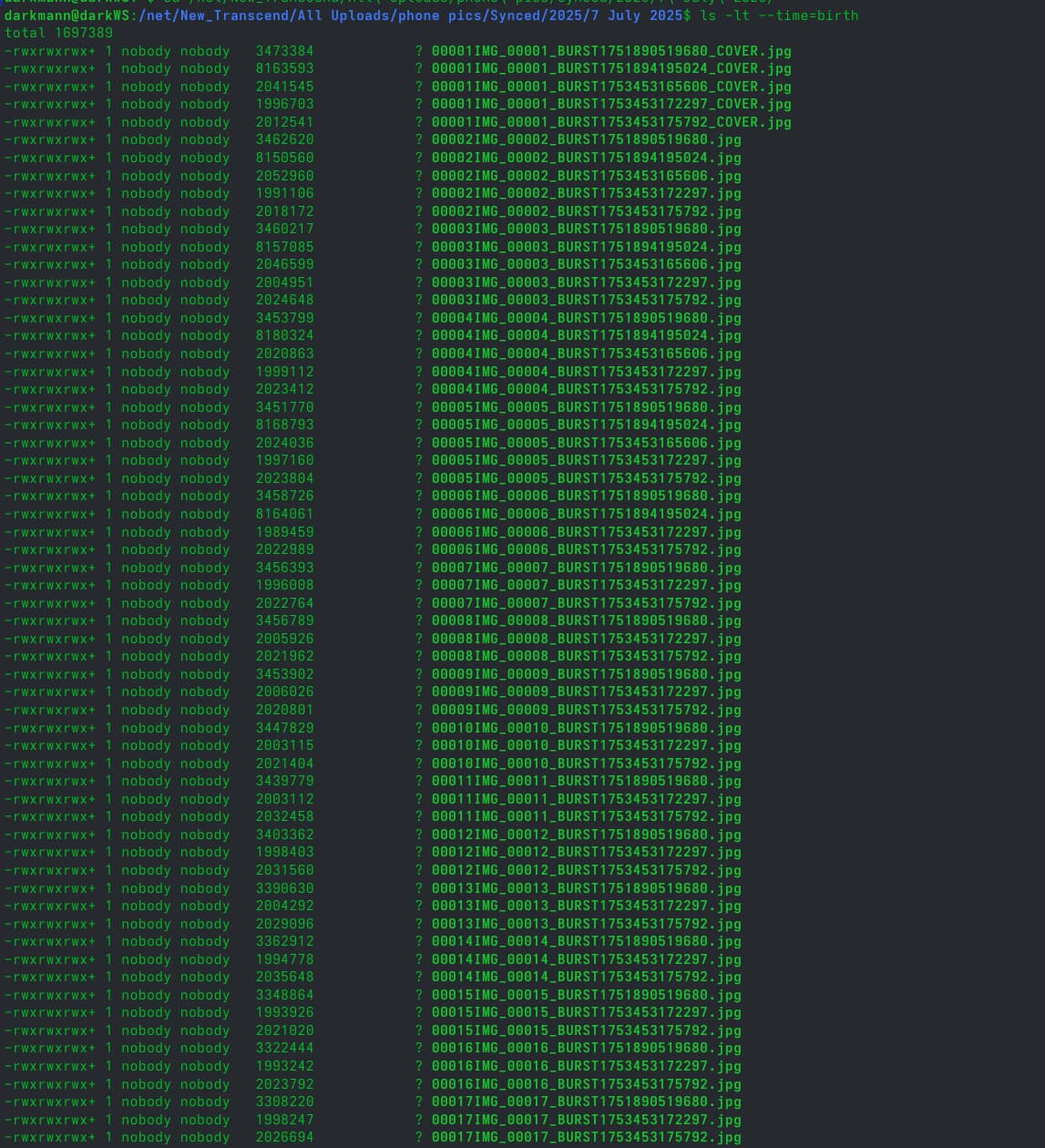 Everything that has originated from a phone or a camera currently exists as its own files on the NAS - all my screenshots of the ls -lt --time=birth are of folders of files that are no longer live on their original devices. I.E. the a6700’s pictures were transferred off of its SD card onto the NAS, and the phone’s pictures, brought onto the NAS via Syncthing, are pulled out of the “live”/synced folder and archived monthly. Nothing is mounted as media (unless there’s something I’m missing).