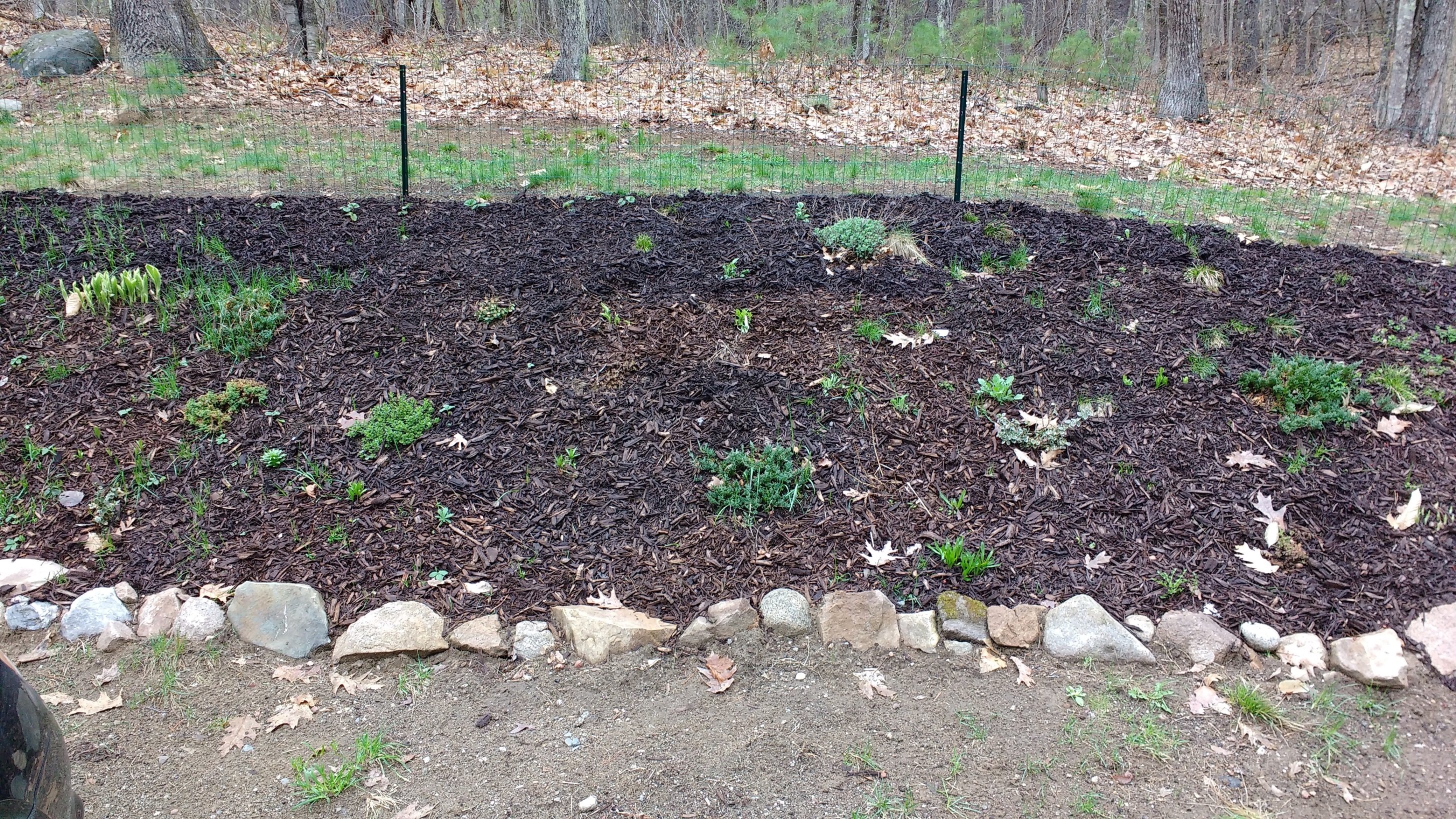 Here's a picture of the flowery/shrubbery garden. Everything is a bit late to start this year since the weather was being annoying, but it's starting to grow in.